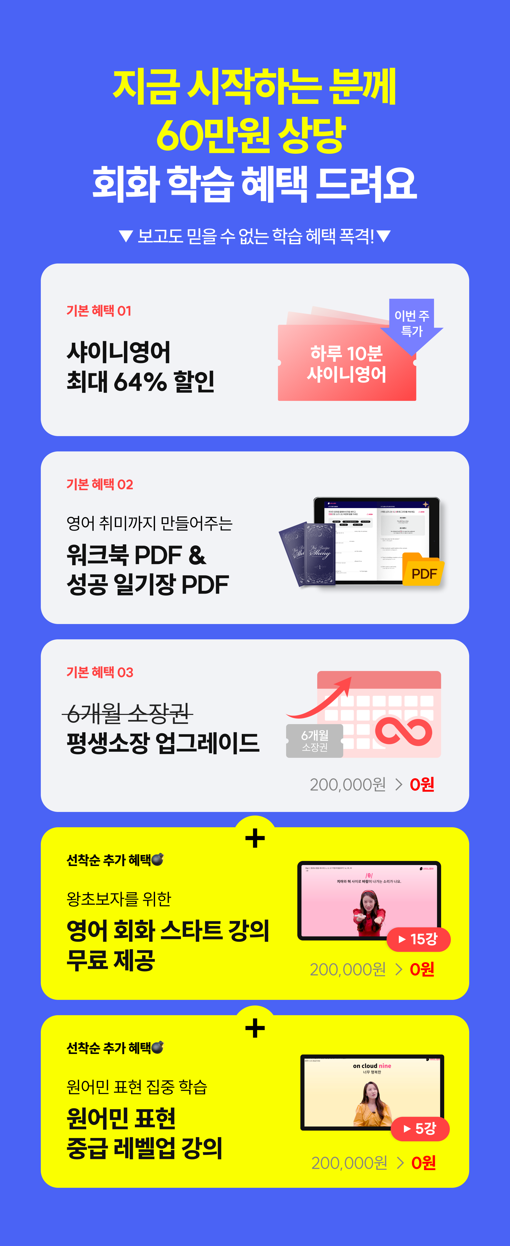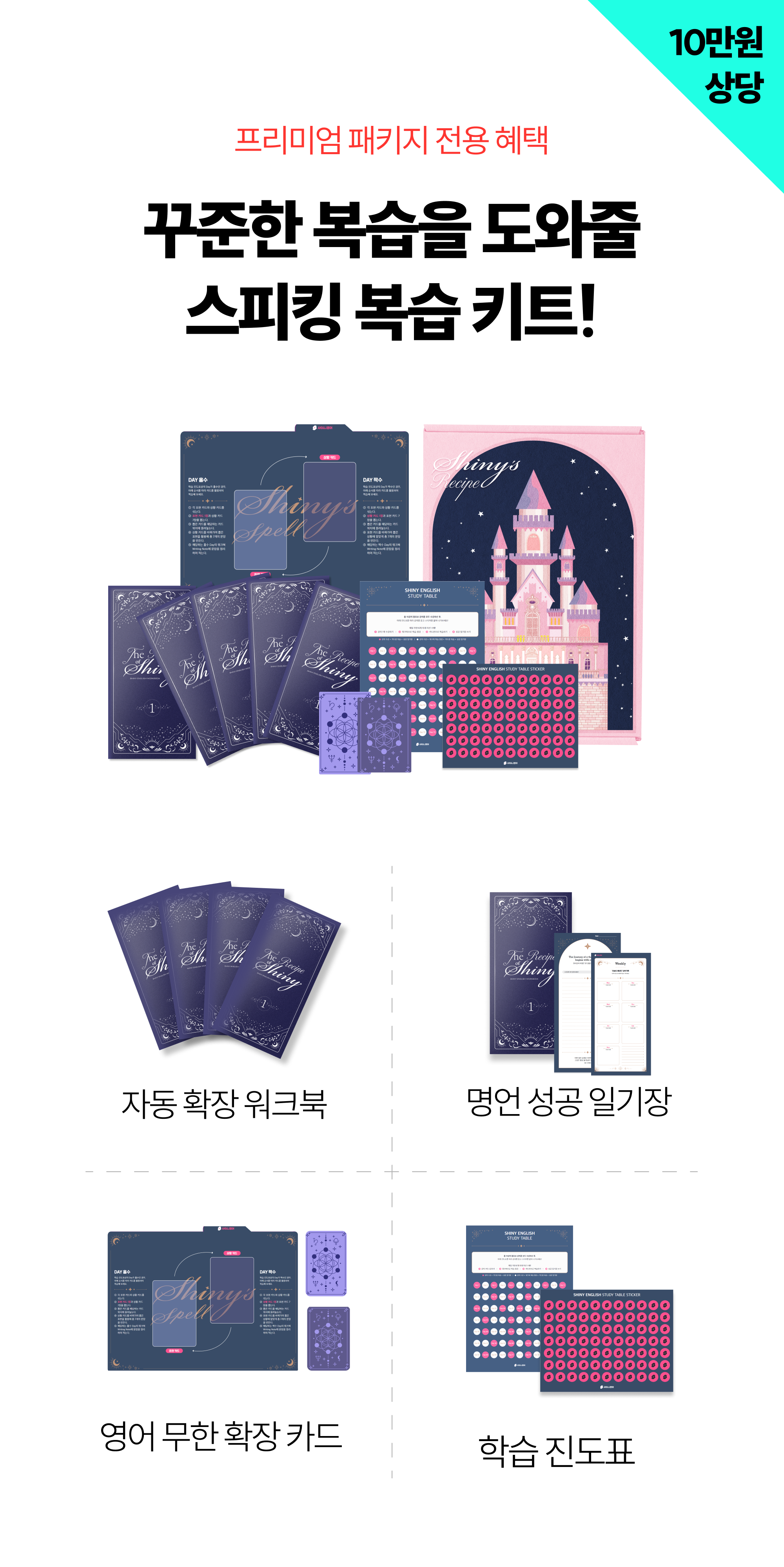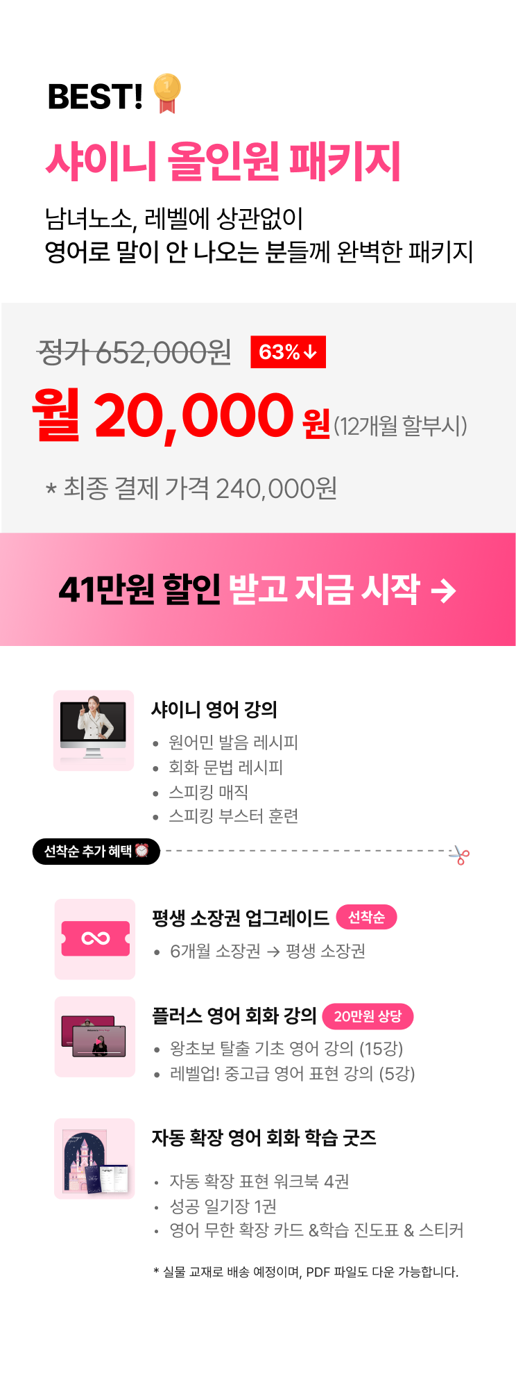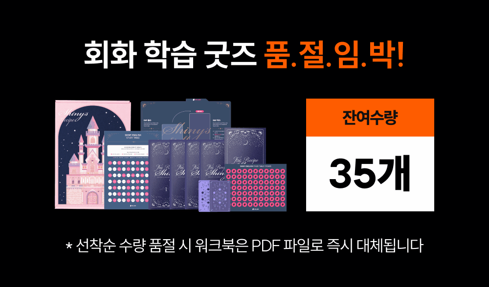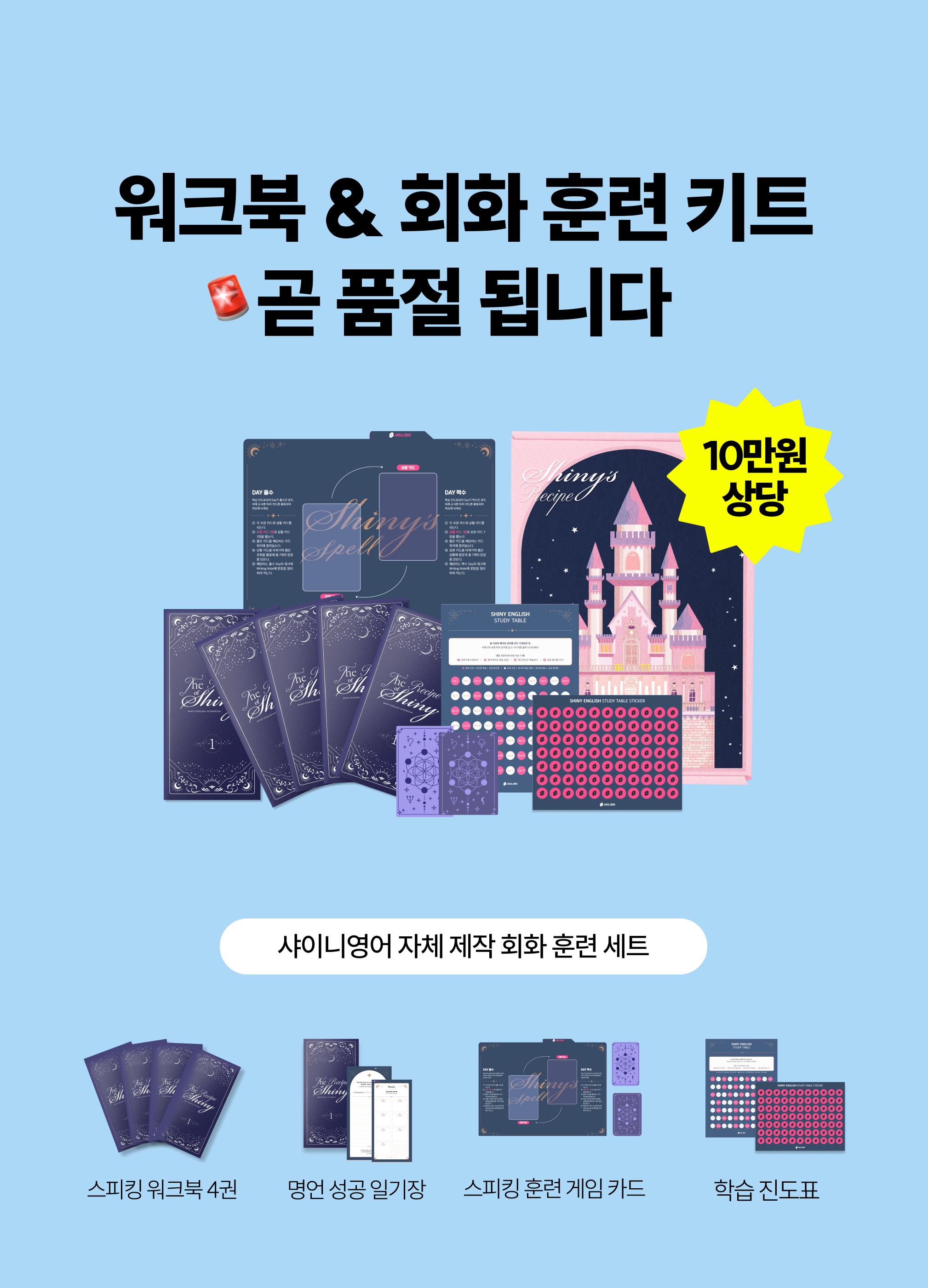 회화학습법 리얼 후기 강의 체험 한정 혜택 왜 하루 10분인가요? 45개가 2035개로 확장 되는 이유 샤이니 영어는 이렇게 공부해요! 옆으로 넘겨서 이번 주만 받을 수 있는 회화 학습 혜택을 확인하세요↔ 새롭게 시작해서 기대됩니다. ⭐⭐⭐⭐⭐ 복잡하고 머리아픈 방법이 아니고, 그냥 따라말하고 복습하고~ 확장하는 방식이라 잘 배우고 있습니다. 선물로 주신 워크북도 잘 활용 중입니다. 늘 감사합니다 작성자 : 정성민 작성일 : 2024.2.13 저도 성공할 수 있을까요!? ⭐⭐⭐⭐⭐ 일단 지금 2주정도 듣고 있어요ㅎㅎ 저는 진짜 초딩 영어 수준인데도 쌤 강의는 부담 없이 잘 듣고 있어요^^ 강의 틈틈이 응원해주셔서 덩달아 열심히 해보고 있네네요..! 영어로 말하고 싶어요 진심! 쫑아❤ 2024.2.05 너무나도 추천하고 싶네요 ⭐⭐⭐⭐⭐ 1. 강의가 재밌다. 2. 선생님이 너무너무 좋으시다 (긍정 에너지 짱!) 3. 영어로 말을 막 시키셔서 좋다. (실력 업ㅎ) 작성자 : 하늘쌤 작성일 : 2024.2.4 넘 좋아요~~!!!! ⭐⭐⭐⭐⭐ 현재 넘 만족하구 ㅜ 듣고있습니다!! 최고!! 옆방에서 남편이 왜이렇게 혼자 중얼거리냐구~ㅋㅋㅋㅋ 저보고 열심히 배우는 모습이 보기 좋다고 하네요ㅎㅎ..아자아자!! 작성자 : kangnahy 2024.1.29 더듬거리지만 말을 하긴 해요 ⭐⭐⭐⭐⭐ 저 왕초보였는데요 이렇게 눈에 띄게 성과?가 있는건 처음이에요~ 처음부터 끝까지 선생님이 같이 이끌어 주셔서 가능했던 것 같아요 감사합니다! 성장이좋아 2024.1.14 전화 영어 실패 후 샤이니 영어로 ⭐⭐⭐⭐⭐ 영어 회화가 꼭 필요해서 전화영어, 어플 영어 진짜 많이 시도해봤는데.. 이게 입이 안 떨어지고 긴장되니까 더 주눅들고.. 그러다 샤이니 영어 해봤는데^^ 부담도 없고 확실하게 완벽한 문장으로 연습하니까 정말 좋습니다. 최리 2023.12.31 [왕초보] 회화 스타트 강의 커리큘럼 [본강의] Day 1 ~ 21 학습 커리큘럼 [본강의] Day 22 ~ 39 학습 커리큘럼 [본강의] Day 40 ~ 59 학습 커리큘럼 [본강의] Day 60 ~ 77 학습 커리큘럼 [레벨업] 원어민표현 강의 커리큘럼 워크북 & 복습 키트 자세히 보기 👀 스크롤을 내리면 더 자세한 설명이 나와있어요! [슈퍼패키지 전용] 회화 특강 자세히보기 👀 🚨긴급 안내🚨 한정 수량으로 제작된 회화 훈련 세트가 예상 소진 시점보다 훨씬 빠르게 소진되고 있습니다.지금 이 글이 보이시는 분들까지는 100% 제공이 가능합니다. 품절 즉시 PDF 파일로 대체 될 수 있으니 서둘러 주세요. 상품구성 1) 하루 10분 입 트이는 매직 강의 (77강) 2) 진찐 왕초보를 위한 영어 레시피 강의 (15강) 3) 원어민 표현 배우기 이디엄 강의 (5강) 4) 워크북 & 성공 일기장 PDF ※ 정상 수강기간은 90일이며 이후 평생 소장입니다. 환불규정 – 환불신청서 제출 및 반품은 수령(배송완료)일 기준 7일 이내 가능합니다. – 수강 시작 후 7일 이내, 5강 미만 수강 시에는 100% 환불 가능합니다. – 수강 시작 후 7일 이내 5강 이상 수강한 경우에는 정상 수강기간을 기준으로 수강진도에 따라 환불 가능합니다. – 수강 시작일은 결제일로부터 기간이 산정됩니다. (사전 예약 강의의 경우 1차 강의 오픈일부터) – 회사 사정으로 수강 시작이 늦어진 경우에는 해당 일정 만큼 수강 시작일이 연기됩니다. – 더 자세한 환불 규정은 [취소/환불정책]을 참고 바랍니다. 유의사항 – 구성품은 사전고지 없이 제외 또는 변경될 수 있습니다. – 학습지, 온라인 강의, 굿즈는 패키지 상품으로 단독 구매가 불가합니다. – 상황에 따라 사전 공지 없이 할인이 조기 마감되거나 연장될 수 있습니다. – 이벤트, 프로모션 등으로 가격이 변동될 수 있으며, 이로 인한 환불이나 가격 보상은 불가능합니다. – 분할 출고되는 상품을 구매하신 고객 중, 제품 수령지 변경을 원하실 경우 고객센터로 문의하시기 바랍니다. – 제품 수령지 미변경으로 인한 분실/배송비 부담에 대해서는 책임지지 않습니다. – 천재지변, 폐업 등 서비스 중단이 불가피한 상황에는 서비스가 종료될 수 있습니다. – 소셜로 가입한 경우 소셜 로그인을 통해서만 이용이 가능하며 다수의 기기에서 수강이 불가합니다. ※ 위 내용은 회사 사정에 따라 언제든지 변경될 수 있습니다. ※ 유의사항 미숙지로 인한 불이익에 대해 책임지지 않습니다.