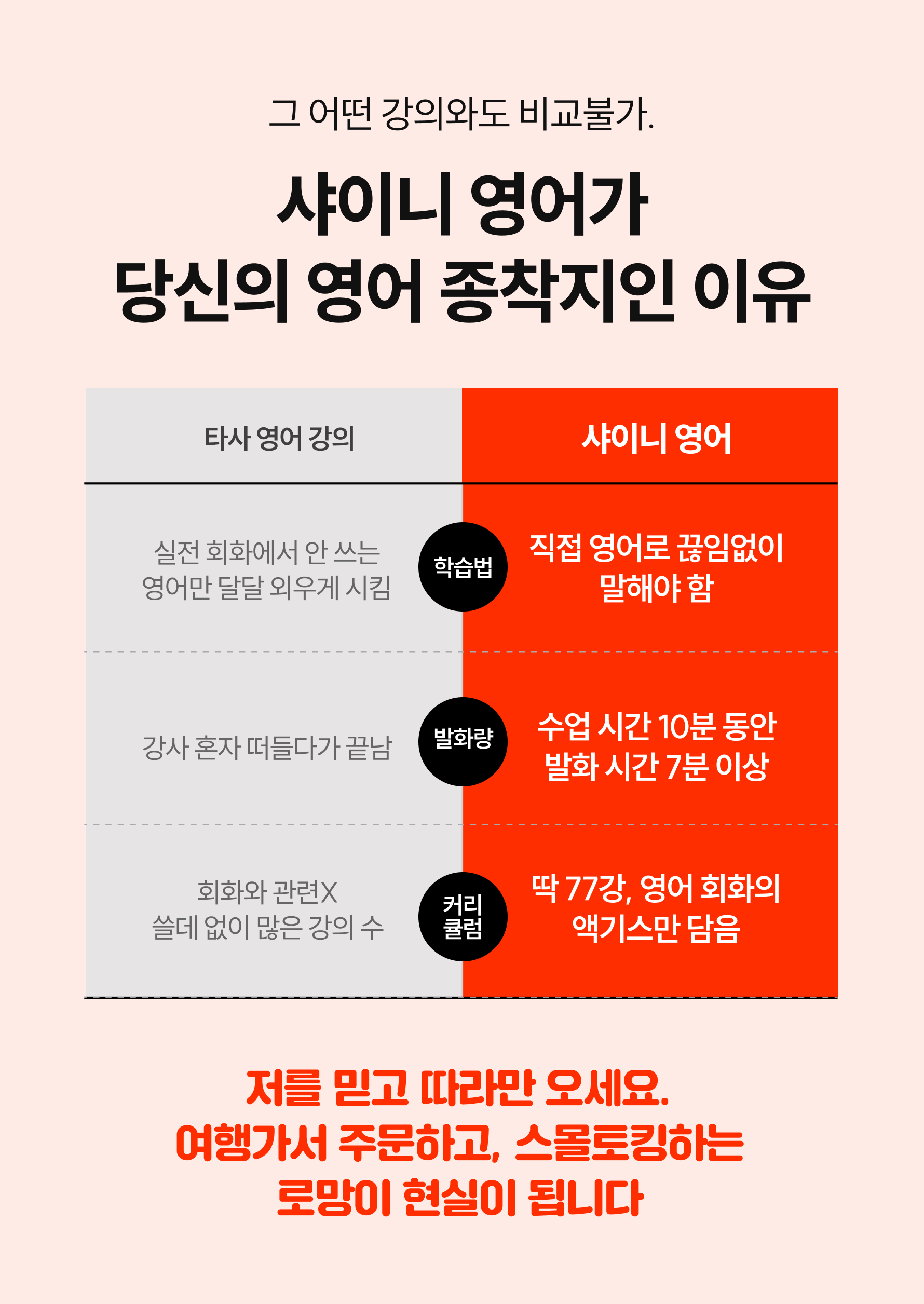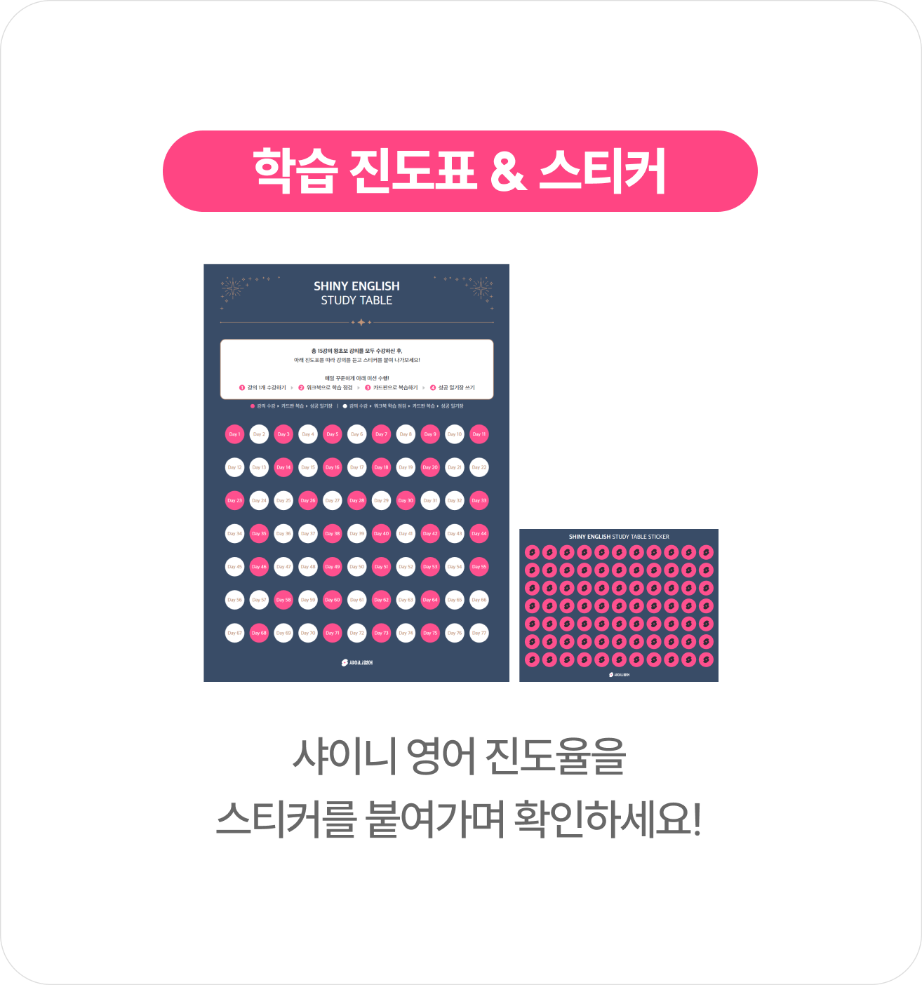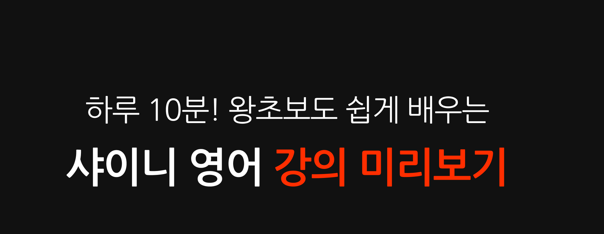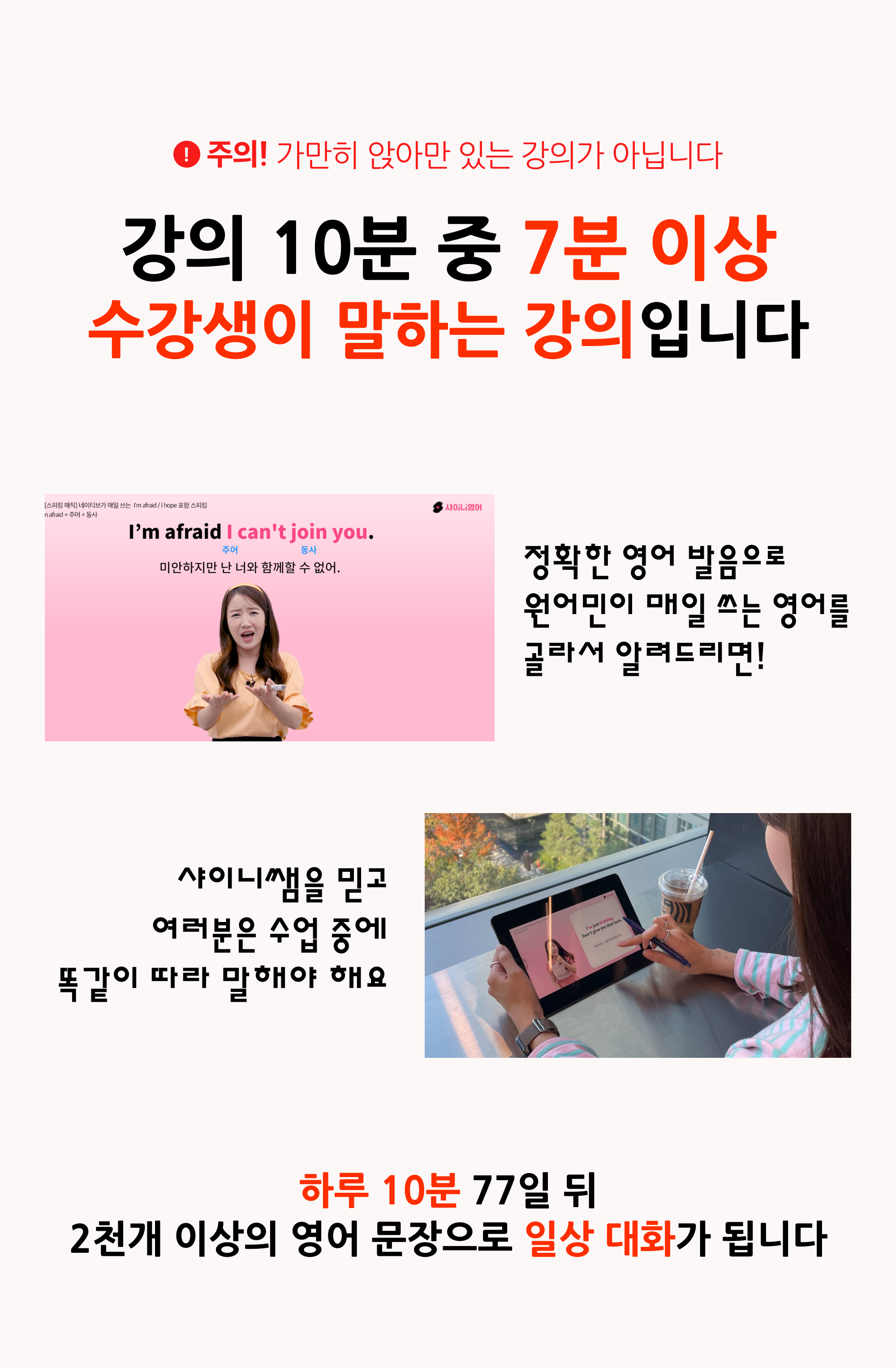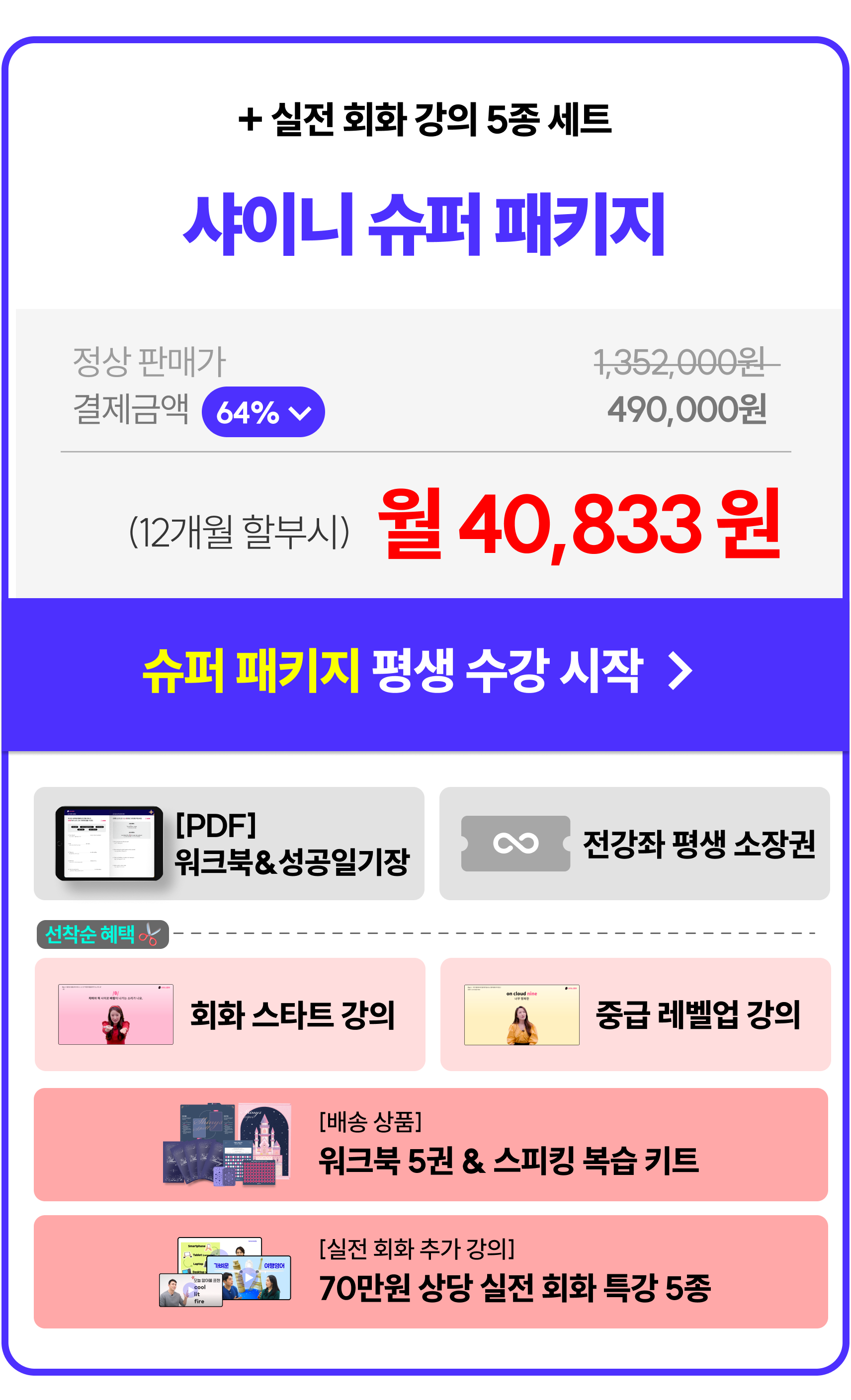 회화학습법 리얼 후기 강의 체험 한정 혜택 왜 하루 10분인가요? 45개가 2035개로 확장 되는 이유 샤이니 영어는 이렇게 공부해요! 옆으로 넘겨서 이번 주만 받을 수 있는 회화 학습 혜택을 확인하세요↔ 새롭게 시작해서 기대됩니다. ⭐⭐⭐⭐⭐ 복잡하고 머리아픈 방법이 아니고, 그냥 따라말하고 복습하고~ 확장하는 방식이라 잘 배우고 있습니다. 선물로 주신 워크북도 잘 활용 중입니다. 늘 감사합니다 작성자 : 정성민 작성일 : 2024.2.13 저도 성공할 수 있을까요!? ⭐⭐⭐⭐⭐ 일단 지금 2주정도 듣고 있어요ㅎㅎ 저는 진짜 초딩 영어 수준인데도 쌤 강의는 부담 없이 잘 듣고 있어요^^ 강의 틈틈이 응원해주셔서 덩달아 열심히 해보고 있네네요..! 영어로 말하고 싶어요 진심! 쫑아❤ 2024.2.05 너무나도 추천하고 싶네요 ⭐⭐⭐⭐⭐ 1. 강의가 재밌다. 2. 선생님이 너무너무 좋으시다 (긍정 에너지 짱!) 3. 영어로 말을 막 시키셔서 좋다. (실력 업ㅎ) 작성자 : 하늘쌤 작성일 : 2024.2.4 넘 좋아요~~!!!! ⭐⭐⭐⭐⭐ 현재 넘 만족하구 ㅜ 듣고있습니다!! 최고!! 옆방에서 남편이 왜이렇게 혼자 중얼거리냐구~ㅋㅋㅋㅋ 저보고 열심히 배우는 모습이 보기 좋다고 하네요ㅎㅎ..아자아자!! 작성자 : kangnahy 2024.1.29 더듬거리지만 말을 하긴 해요 ⭐⭐⭐⭐⭐ 저 왕초보였는데요 이렇게 눈에 띄게 성과?가 있는건 처음이에요~ 처음부터 끝까지 선생님이 같이 이끌어 주셔서 가능했던 것 같아요 감사합니다! 성장이좋아 2024.1.14 전화 영어 실패 후 샤이니 영어로 ⭐⭐⭐⭐⭐ 영어 회화가 꼭 필요해서 전화영어, 어플 영어 진짜 많이 시도해봤는데.. 이게 입이 안 떨어지고 긴장되니까 더 주눅들고.. 그러다 샤이니 영어 해봤는데^^ 부담도 없고 확실하게 완벽한 문장으로 연습하니까 정말 좋습니다. 최리 2023.12.31 [왕초보] 회화 스타트 강의 커리큘럼 [본강의] Day 1 ~ 21 학습 커리큘럼 [본강의] Day 22 ~ 39 학습 커리큘럼 [본강의] Day 40 ~ 59 학습 커리큘럼 [본강의] Day 60 ~ 77 학습 커리큘럼 [레벨업] 원어민표현 강의 커리큘럼 워크북 & 복습 키트 자세히 보기 👀 스크롤을 내리면 더 자세한 설명이 나와있어요! [슈퍼패키지 전용] 회화 특강 자세히보기 👀 🚨긴급 안내🚨 한정 수량으로 제작된 회화 훈련 세트가 예상 소진 시점보다 훨씬 빠르게 소진되고 있습니다.지금 이 글이 보이시는 분들까지는 100% 제공이 가능합니다. 품절 즉시 PDF 파일로 대체 될 수 있으니 서둘러 주세요. 상품구성 1) 하루 10분 입 트이는 매직 강의 (77강) 2) 진찐 왕초보를 위한 영어 레시피 강의 (15강) 3) 원어민 표현 배우기 이디엄 강의 (5강) 4) 워크북 & 성공 일기장 PDF ※ 정상 수강기간은 90일이며 이후 평생 소장입니다. 환불규정 – 환불신청서 제출 및 반품은 수령(배송완료)일 기준 7일 이내 가능합니다. – 수강 시작 후 7일 이내, 5강 미만 수강 시에는 100% 환불 가능합니다. – 수강 시작 후 7일 이내 5강 이상 수강한 경우에는 정상 수강기간을 기준으로 수강진도에 따라 환불 가능합니다. – 수강 시작일은 결제일로부터 기간이 산정됩니다. (사전 예약 강의의 경우 1차 강의 오픈일부터) – 회사 사정으로 수강 시작이 늦어진 경우에는 해당 일정 만큼 수강 시작일이 연기됩니다. – 더 자세한 환불 규정은 [취소/환불정책]을 참고 바랍니다. 유의사항 – 구성품은 사전고지 없이 제외 또는 변경될 수 있습니다. – 학습지, 온라인 강의, 굿즈는 패키지 상품으로 단독 구매가 불가합니다. – 상황에 따라 사전 공지 없이 할인이 조기 마감되거나 연장될 수 있습니다. – 이벤트, 프로모션 등으로 가격이 변동될 수 있으며, 이로 인한 환불이나 가격 보상은 불가능합니다. – 분할 출고되는 상품을 구매하신 고객 중, 제품 수령지 변경을 원하실 경우 고객센터로 문의하시기 바랍니다. – 제품 수령지 미변경으로 인한 분실/배송비 부담에 대해서는 책임지지 않습니다. – 천재지변, 폐업 등 서비스 중단이 불가피한 상황에는 서비스가 종료될 수 있습니다. – 소셜로 가입한 경우 소셜 로그인을 통해서만 이용이 가능하며 다수의 기기에서 수강이 불가합니다. ※ 위 내용은 회사 사정에 따라 언제든지 변경될 수 있습니다. ※ 유의사항 미숙지로 인한 불이익에 대해 책임지지 않습니다.