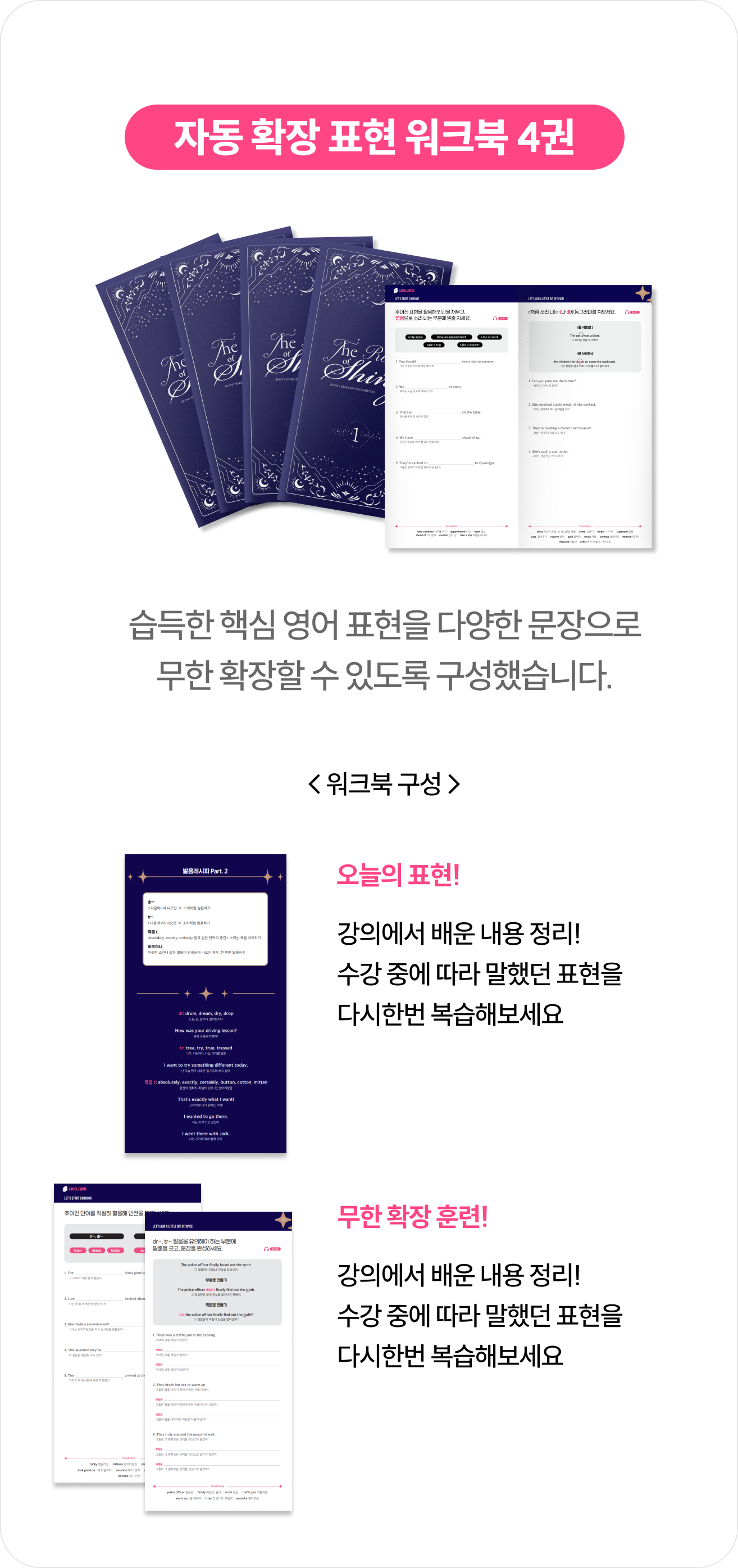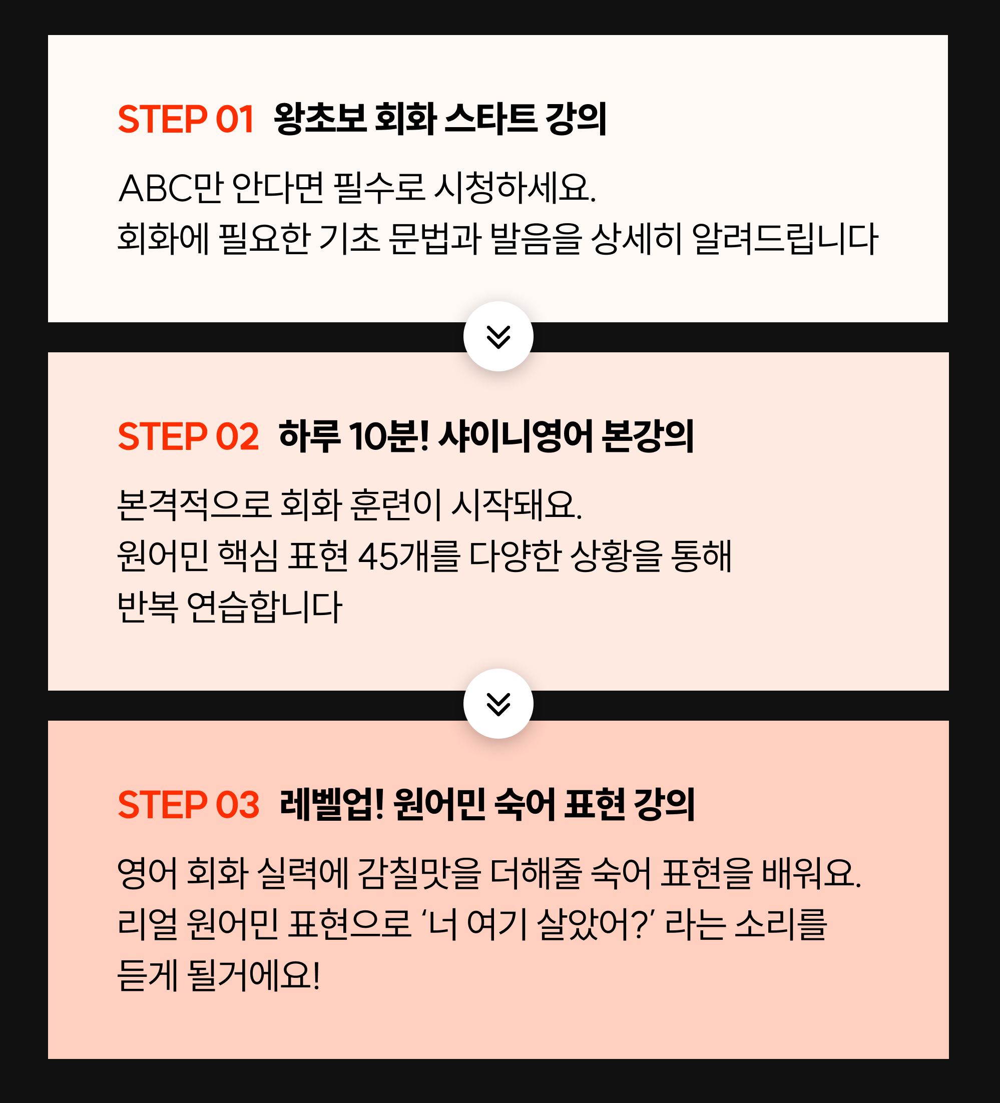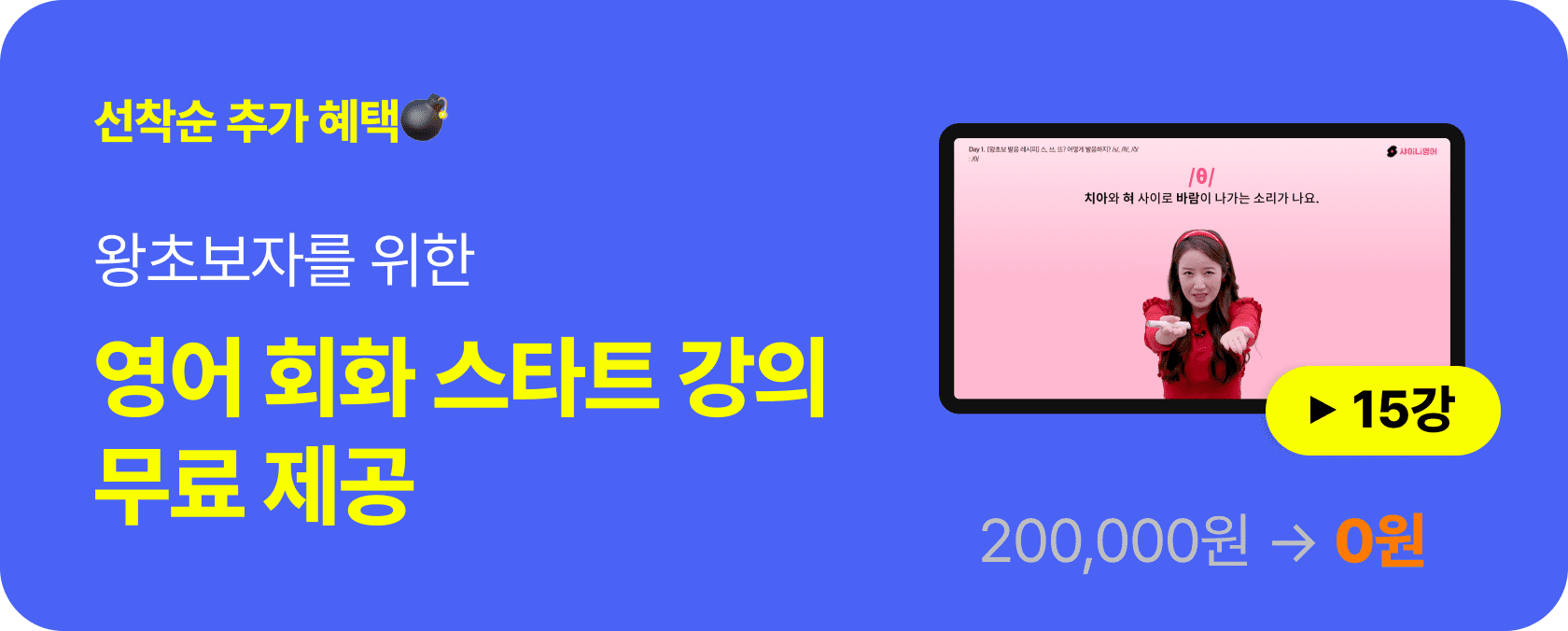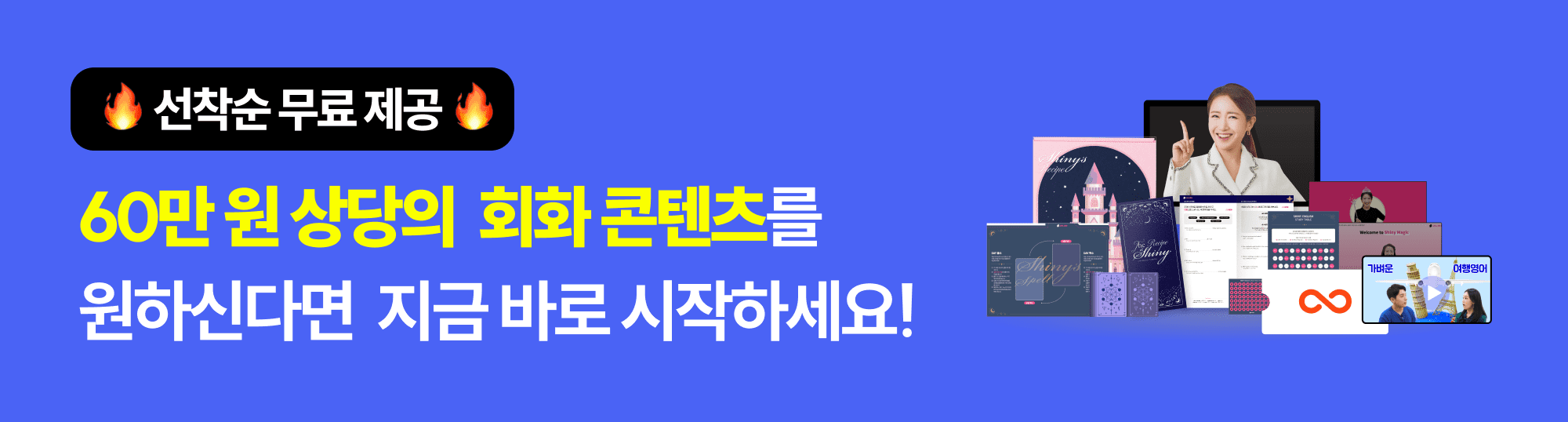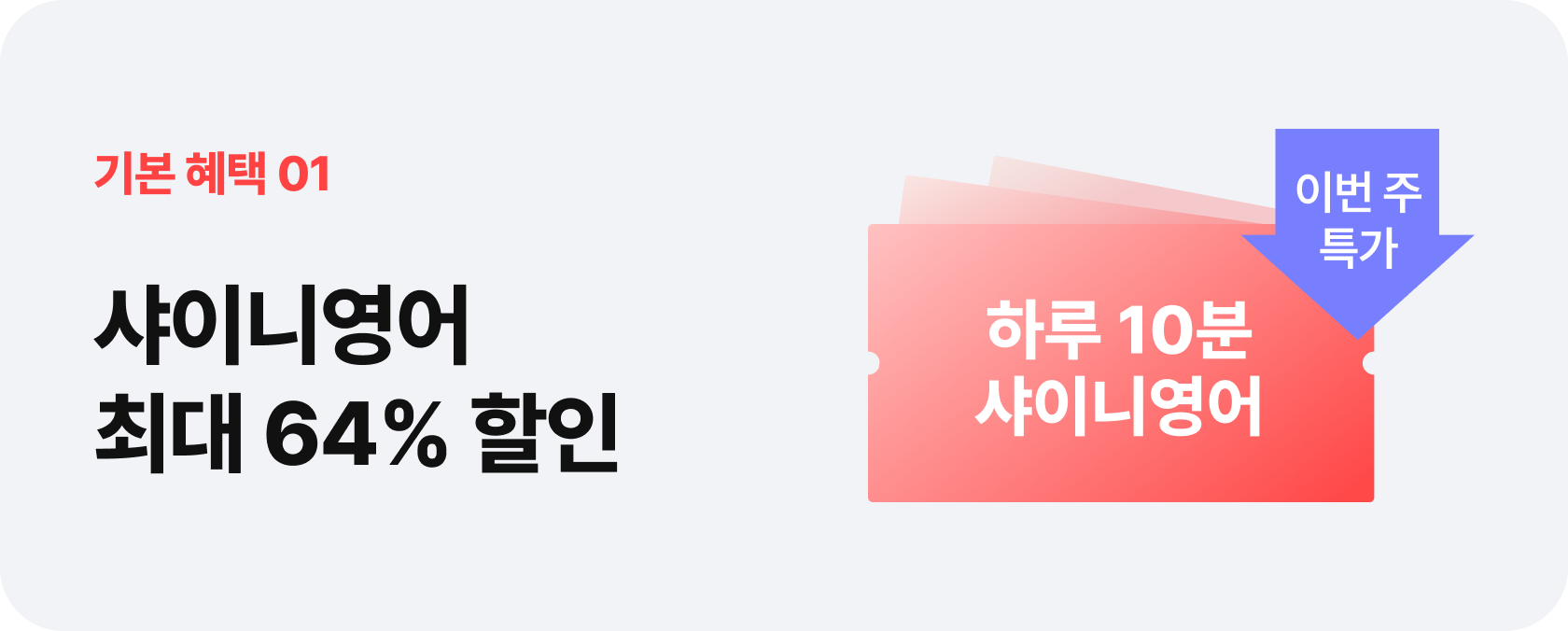 회화학습법 리얼 후기 강의 체험 한정 혜택 왜 하루 10분인가요? 45개가 2035개로 확장 되는 이유 샤이니 영어는 이렇게 공부해요! 옆으로 넘겨서 이번 주만 받을 수 있는 회화 학습 혜택을 확인하세요↔ 새롭게 시작해서 기대됩니다. ⭐⭐⭐⭐⭐ 복잡하고 머리아픈 방법이 아니고, 그냥 따라말하고 복습하고~ 확장하는 방식이라 잘 배우고 있습니다. 선물로 주신 워크북도 잘 활용 중입니다. 늘 감사합니다 작성자 : 정성민 작성일 : 2024.2.13 저도 성공할 수 있을까요!? ⭐⭐⭐⭐⭐ 일단 지금 2주정도 듣고 있어요ㅎㅎ 저는 진짜 초딩 영어 수준인데도 쌤 강의는 부담 없이 잘 듣고 있어요^^ 강의 틈틈이 응원해주셔서 덩달아 열심히 해보고 있네네요..! 영어로 말하고 싶어요 진심! 쫑아❤ 2024.2.05 너무나도 추천하고 싶네요 ⭐⭐⭐⭐⭐ 1. 강의가 재밌다. 2. 선생님이 너무너무 좋으시다 (긍정 에너지 짱!) 3. 영어로 말을 막 시키셔서 좋다. (실력 업ㅎ) 작성자 : 하늘쌤 작성일 : 2024.2.4 넘 좋아요~~!!!! ⭐⭐⭐⭐⭐ 현재 넘 만족하구 ㅜ 듣고있습니다!! 최고!! 옆방에서 남편이 왜이렇게 혼자 중얼거리냐구~ㅋㅋㅋㅋ 저보고 열심히 배우는 모습이 보기 좋다고 하네요ㅎㅎ..아자아자!! 작성자 : kangnahy 2024.1.29 더듬거리지만 말을 하긴 해요 ⭐⭐⭐⭐⭐ 저 왕초보였는데요 이렇게 눈에 띄게 성과?가 있는건 처음이에요~ 처음부터 끝까지 선생님이 같이 이끌어 주셔서 가능했던 것 같아요 감사합니다! 성장이좋아 2024.1.14 전화 영어 실패 후 샤이니 영어로 ⭐⭐⭐⭐⭐ 영어 회화가 꼭 필요해서 전화영어, 어플 영어 진짜 많이 시도해봤는데.. 이게 입이 안 떨어지고 긴장되니까 더 주눅들고.. 그러다 샤이니 영어 해봤는데^^ 부담도 없고 확실하게 완벽한 문장으로 연습하니까 정말 좋습니다. 최리 2023.12.31 [왕초보] 회화 스타트 강의 커리큘럼 [본강의] Day 1 ~ 21 학습 커리큘럼 [본강의] Day 22 ~ 39 학습 커리큘럼 [본강의] Day 40 ~ 59 학습 커리큘럼 [본강의] Day 60 ~ 77 학습 커리큘럼 [레벨업] 원어민표현 강의 커리큘럼 워크북 & 복습 키트 자세히 보기 👀 스크롤을 내리면 더 자세한 설명이 나와있어요! [슈퍼패키지 전용] 회화 특강 자세히보기 👀 🚨긴급 안내🚨 한정 수량으로 제작된 회화 훈련 세트가 예상 소진 시점보다 훨씬 빠르게 소진되고 있습니다.지금 이 글이 보이시는 분들까지는 100% 제공이 가능합니다. 품절 즉시 PDF 파일로 대체 될 수 있으니 서둘러 주세요. 상품구성 1) 하루 10분 입 트이는 매직 강의 (77강) 2) 진찐 왕초보를 위한 영어 레시피 강의 (15강) 3) 원어민 표현 배우기 이디엄 강의 (5강) 4) 워크북 & 성공 일기장 PDF ※ 정상 수강기간은 90일이며 이후 평생 소장입니다. 환불규정 – 환불신청서 제출 및 반품은 수령(배송완료)일 기준 7일 이내 가능합니다. – 수강 시작 후 7일 이내, 5강 미만 수강 시에는 100% 환불 가능합니다. – 수강 시작 후 7일 이내 5강 이상 수강한 경우에는 정상 수강기간을 기준으로 수강진도에 따라 환불 가능합니다. – 수강 시작일은 결제일로부터 기간이 산정됩니다. (사전 예약 강의의 경우 1차 강의 오픈일부터) – 회사 사정으로 수강 시작이 늦어진 경우에는 해당 일정 만큼 수강 시작일이 연기됩니다. – 더 자세한 환불 규정은 [취소/환불정책]을 참고 바랍니다. 유의사항 – 구성품은 사전고지 없이 제외 또는 변경될 수 있습니다. – 학습지, 온라인 강의, 굿즈는 패키지 상품으로 단독 구매가 불가합니다. – 상황에 따라 사전 공지 없이 할인이 조기 마감되거나 연장될 수 있습니다. – 이벤트, 프로모션 등으로 가격이 변동될 수 있으며, 이로 인한 환불이나 가격 보상은 불가능합니다. – 분할 출고되는 상품을 구매하신 고객 중, 제품 수령지 변경을 원하실 경우 고객센터로 문의하시기 바랍니다. – 제품 수령지 미변경으로 인한 분실/배송비 부담에 대해서는 책임지지 않습니다. – 천재지변, 폐업 등 서비스 중단이 불가피한 상황에는 서비스가 종료될 수 있습니다. – 소셜로 가입한 경우 소셜 로그인을 통해서만 이용이 가능하며 다수의 기기에서 수강이 불가합니다. ※ 위 내용은 회사 사정에 따라 언제든지 변경될 수 있습니다. ※ 유의사항 미숙지로 인한 불이익에 대해 책임지지 않습니다.