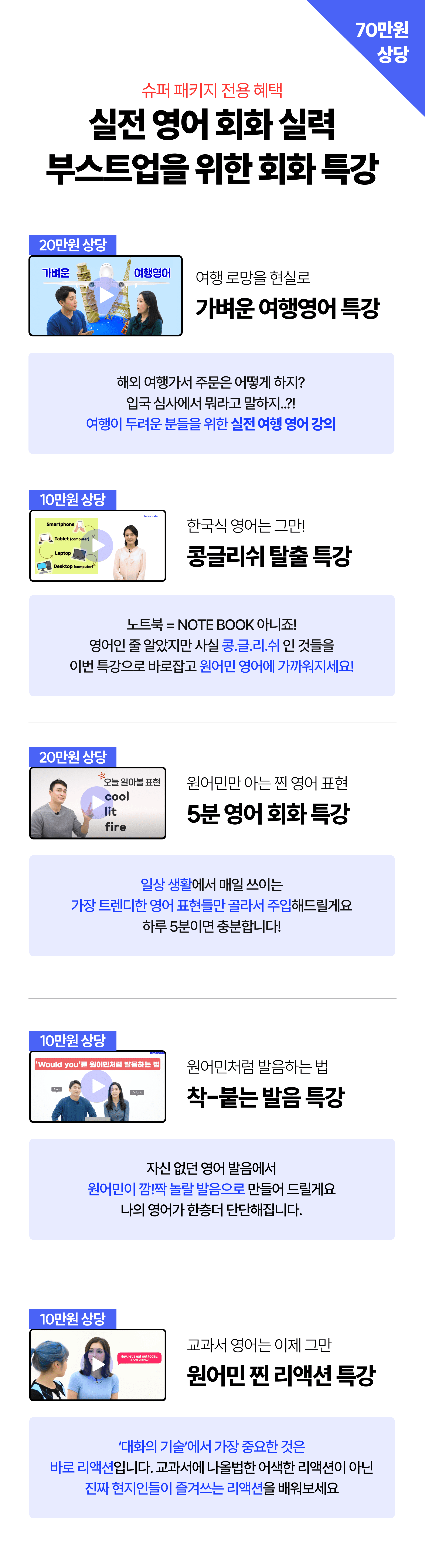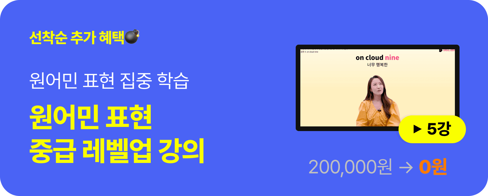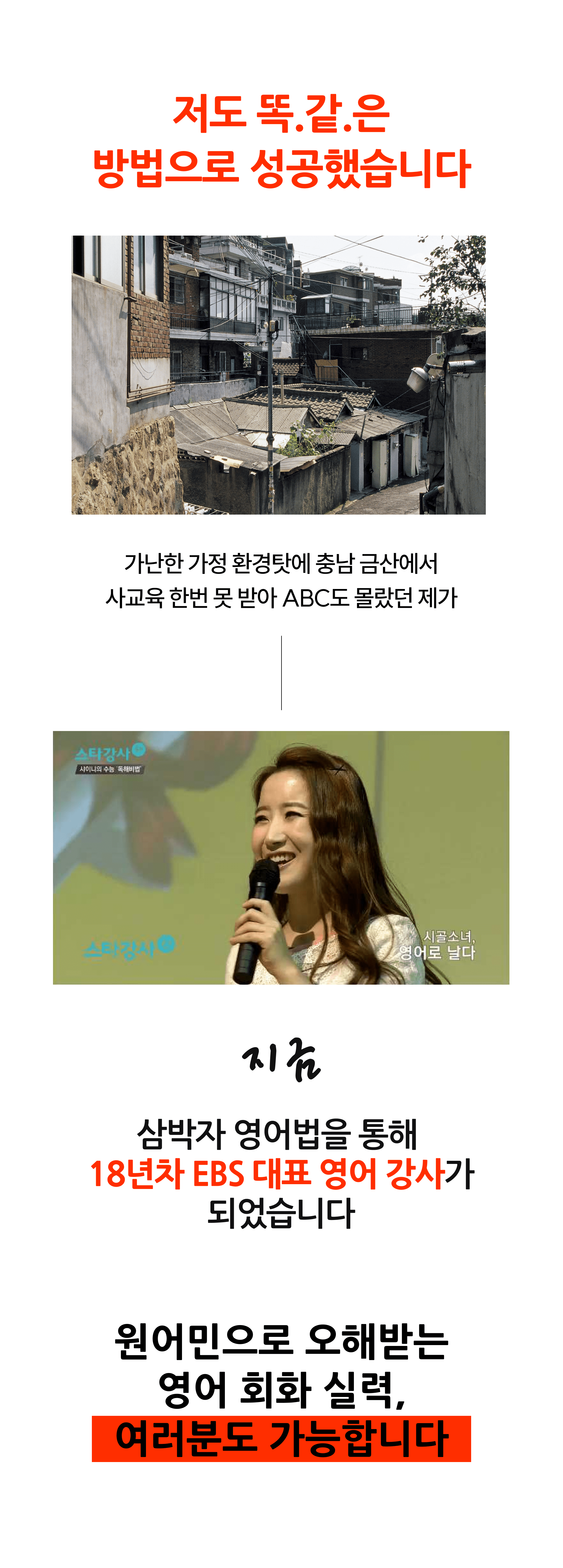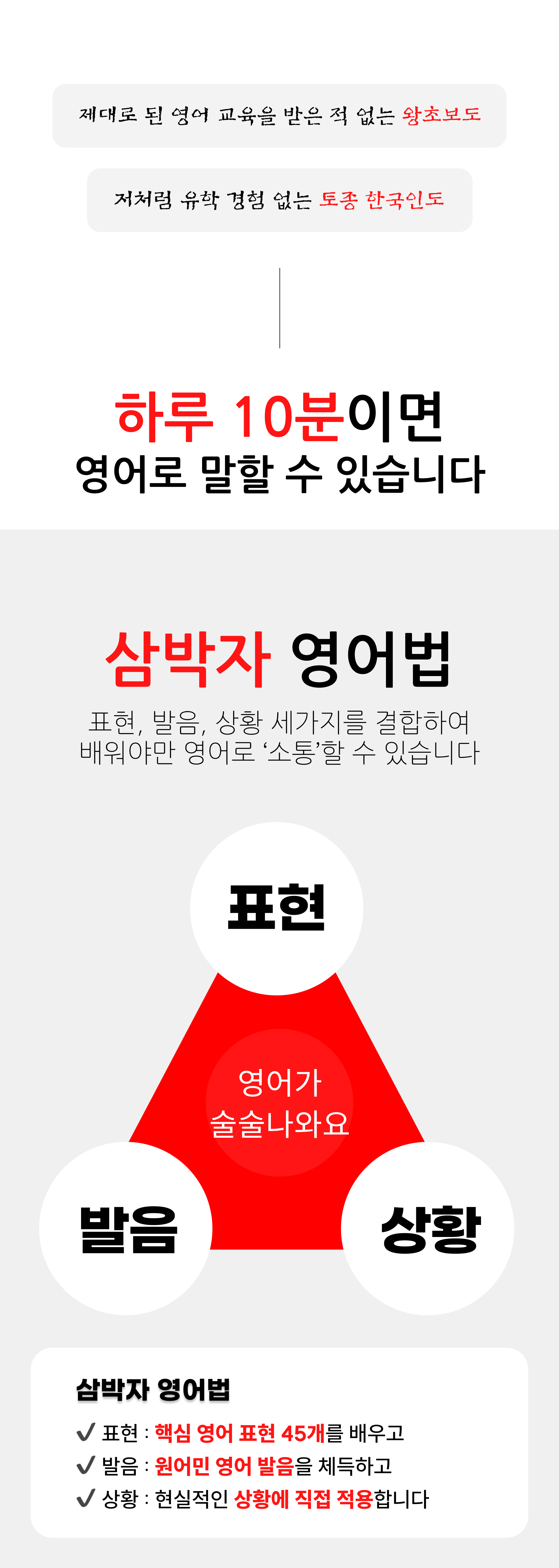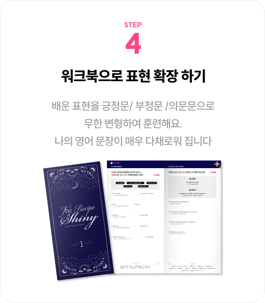 회화학습법 리얼 후기 강의 체험 한정 혜택 왜 하루 10분인가요? 45개가 2035개로 확장 되는 이유 샤이니 영어는 이렇게 공부해요! 옆으로 넘겨서 이번 주만 받을 수 있는 회화 학습 혜택을 확인하세요↔ 새롭게 시작해서 기대됩니다. ⭐⭐⭐⭐⭐ 복잡하고 머리아픈 방법이 아니고, 그냥 따라말하고 복습하고~ 확장하는 방식이라 잘 배우고 있습니다. 선물로 주신 워크북도 잘 활용 중입니다. 늘 감사합니다 작성자 : 정성민 작성일 : 2024.2.13 저도 성공할 수 있을까요!? ⭐⭐⭐⭐⭐ 일단 지금 2주정도 듣고 있어요ㅎㅎ 저는 진짜 초딩 영어 수준인데도 쌤 강의는 부담 없이 잘 듣고 있어요^^ 강의 틈틈이 응원해주셔서 덩달아 열심히 해보고 있네네요..! 영어로 말하고 싶어요 진심! 쫑아❤ 2024.2.05 너무나도 추천하고 싶네요 ⭐⭐⭐⭐⭐ 1. 강의가 재밌다. 2. 선생님이 너무너무 좋으시다 (긍정 에너지 짱!) 3. 영어로 말을 막 시키셔서 좋다. (실력 업ㅎ) 작성자 : 하늘쌤 작성일 : 2024.2.4 넘 좋아요~~!!!! ⭐⭐⭐⭐⭐ 현재 넘 만족하구 ㅜ 듣고있습니다!! 최고!! 옆방에서 남편이 왜이렇게 혼자 중얼거리냐구~ㅋㅋㅋㅋ 저보고 열심히 배우는 모습이 보기 좋다고 하네요ㅎㅎ..아자아자!! 작성자 : kangnahy 2024.1.29 더듬거리지만 말을 하긴 해요 ⭐⭐⭐⭐⭐ 저 왕초보였는데요 이렇게 눈에 띄게 성과?가 있는건 처음이에요~ 처음부터 끝까지 선생님이 같이 이끌어 주셔서 가능했던 것 같아요 감사합니다! 성장이좋아 2024.1.14 전화 영어 실패 후 샤이니 영어로 ⭐⭐⭐⭐⭐ 영어 회화가 꼭 필요해서 전화영어, 어플 영어 진짜 많이 시도해봤는데.. 이게 입이 안 떨어지고 긴장되니까 더 주눅들고.. 그러다 샤이니 영어 해봤는데^^ 부담도 없고 확실하게 완벽한 문장으로 연습하니까 정말 좋습니다. 최리 2023.12.31 [왕초보] 회화 스타트 강의 커리큘럼 [본강의] Day 1 ~ 21 학습 커리큘럼 [본강의] Day 22 ~ 39 학습 커리큘럼 [본강의] Day 40 ~ 59 학습 커리큘럼 [본강의] Day 60 ~ 77 학습 커리큘럼 [레벨업] 원어민표현 강의 커리큘럼 워크북 & 복습 키트 자세히 보기 👀 스크롤을 내리면 더 자세한 설명이 나와있어요! [슈퍼패키지 전용] 회화 특강 자세히보기 👀 🚨긴급 안내🚨 한정 수량으로 제작된 회화 훈련 세트가 예상 소진 시점보다 훨씬 빠르게 소진되고 있습니다.지금 이 글이 보이시는 분들까지는 100% 제공이 가능합니다. 품절 즉시 PDF 파일로 대체 될 수 있으니 서둘러 주세요. 상품구성 1) 하루 10분 입 트이는 매직 강의 (77강) 2) 진찐 왕초보를 위한 영어 레시피 강의 (15강) 3) 원어민 표현 배우기 이디엄 강의 (5강) 4) 워크북 & 성공 일기장 PDF ※ 정상 수강기간은 90일이며 이후 평생 소장입니다. 환불규정 – 환불신청서 제출 및 반품은 수령(배송완료)일 기준 7일 이내 가능합니다. – 수강 시작 후 7일 이내, 5강 미만 수강 시에는 100% 환불 가능합니다. – 수강 시작 후 7일 이내 5강 이상 수강한 경우에는 정상 수강기간을 기준으로 수강진도에 따라 환불 가능합니다. – 수강 시작일은 결제일로부터 기간이 산정됩니다. (사전 예약 강의의 경우 1차 강의 오픈일부터) – 회사 사정으로 수강 시작이 늦어진 경우에는 해당 일정 만큼 수강 시작일이 연기됩니다. – 더 자세한 환불 규정은 [취소/환불정책]을 참고 바랍니다. 유의사항 – 구성품은 사전고지 없이 제외 또는 변경될 수 있습니다. – 학습지, 온라인 강의, 굿즈는 패키지 상품으로 단독 구매가 불가합니다. – 상황에 따라 사전 공지 없이 할인이 조기 마감되거나 연장될 수 있습니다. – 이벤트, 프로모션 등으로 가격이 변동될 수 있으며, 이로 인한 환불이나 가격 보상은 불가능합니다. – 분할 출고되는 상품을 구매하신 고객 중, 제품 수령지 변경을 원하실 경우 고객센터로 문의하시기 바랍니다. – 제품 수령지 미변경으로 인한 분실/배송비 부담에 대해서는 책임지지 않습니다. – 천재지변, 폐업 등 서비스 중단이 불가피한 상황에는 서비스가 종료될 수 있습니다. – 소셜로 가입한 경우 소셜 로그인을 통해서만 이용이 가능하며 다수의 기기에서 수강이 불가합니다. ※ 위 내용은 회사 사정에 따라 언제든지 변경될 수 있습니다. ※ 유의사항 미숙지로 인한 불이익에 대해 책임지지 않습니다.