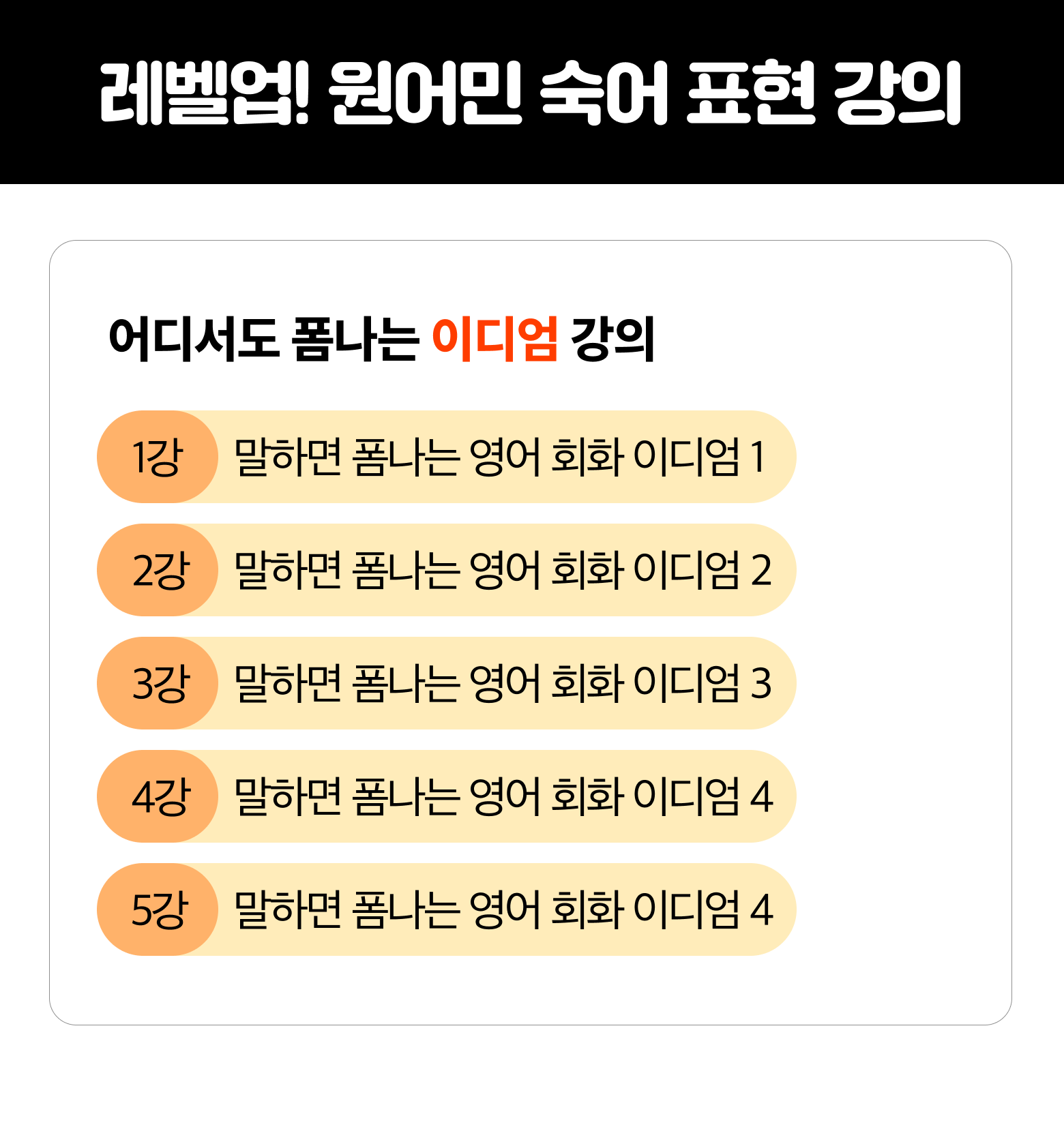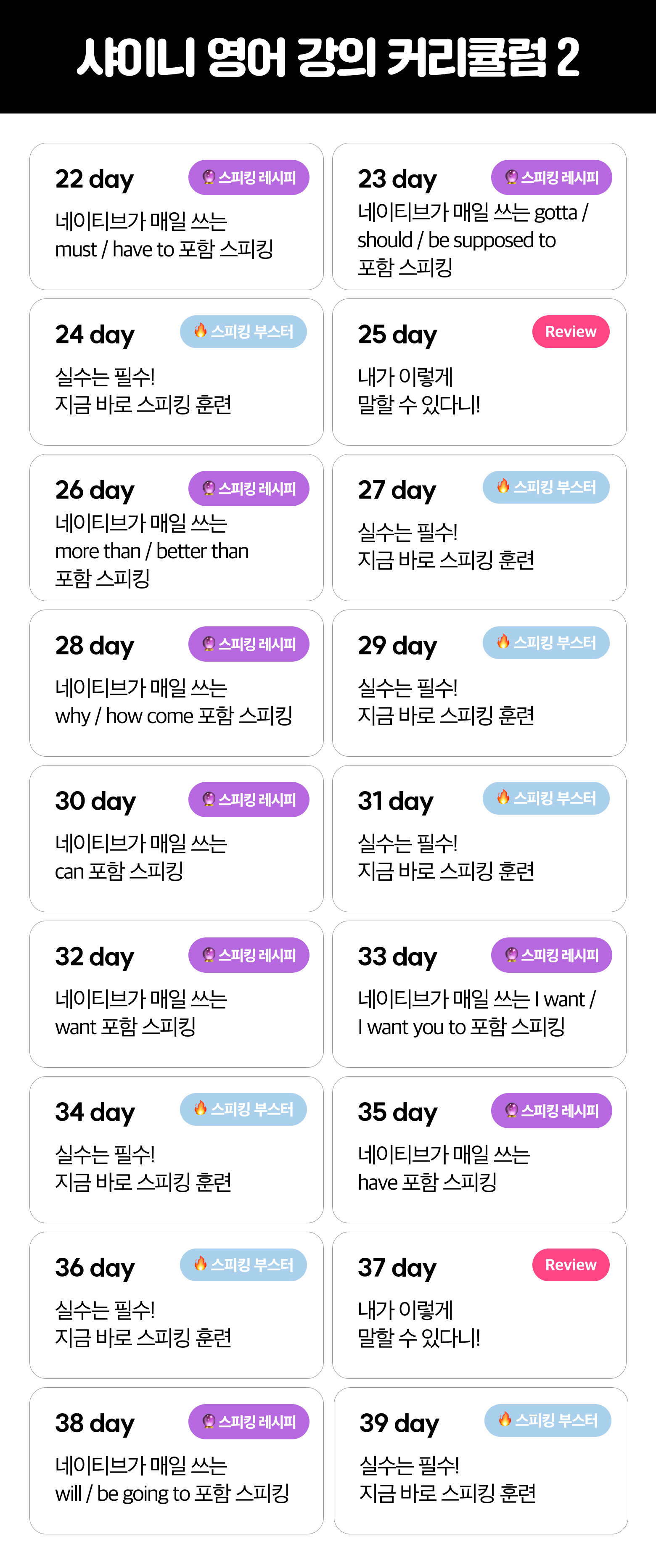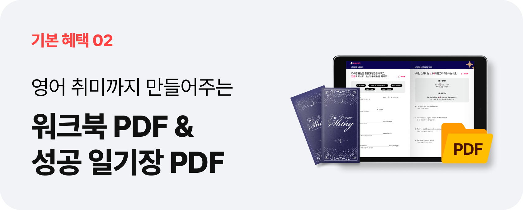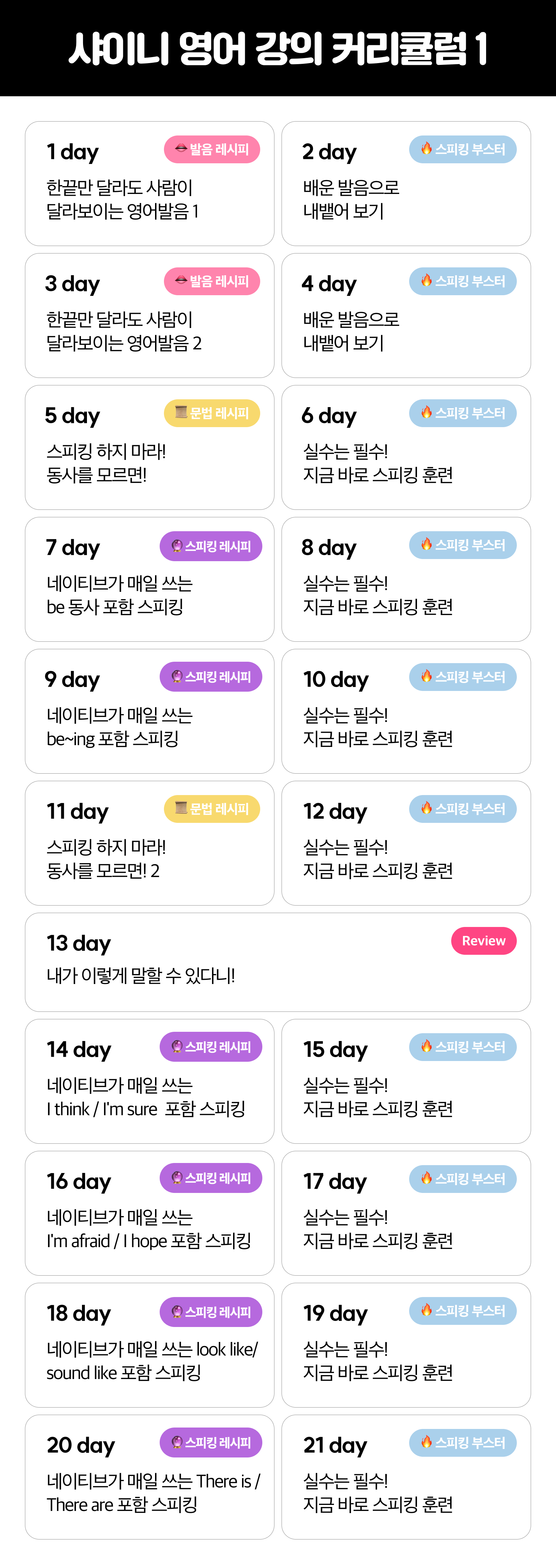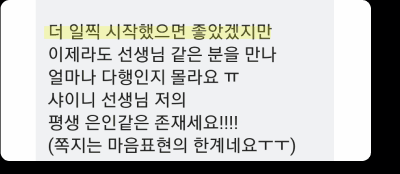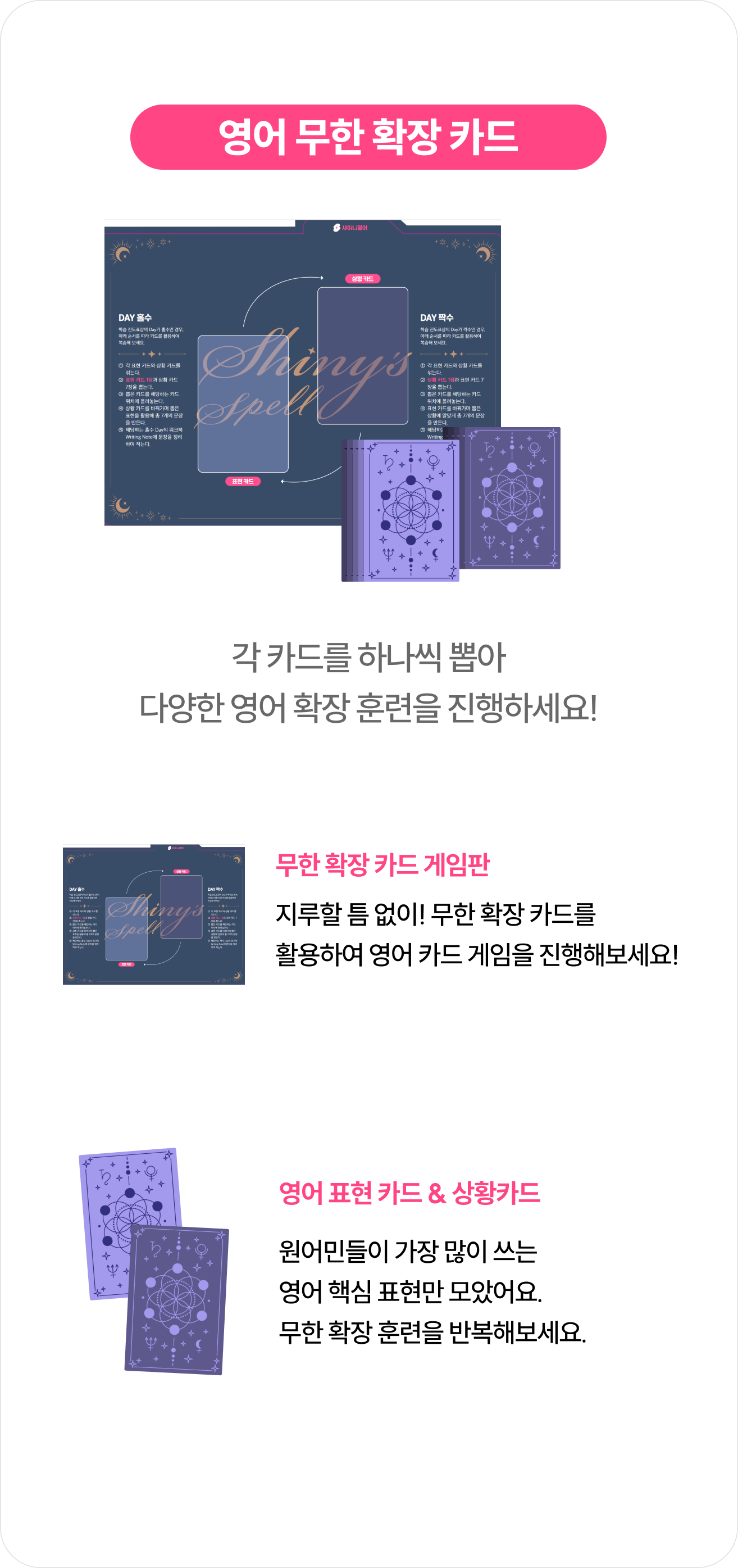 회화학습법 리얼 후기 강의 체험 한정 혜택 왜 하루 10분인가요? 45개가 2035개로 확장 되는 이유 샤이니 영어는 이렇게 공부해요! 옆으로 넘겨서 이번 주만 받을 수 있는 회화 학습 혜택을 확인하세요↔ 새롭게 시작해서 기대됩니다. ⭐⭐⭐⭐⭐ 복잡하고 머리아픈 방법이 아니고, 그냥 따라말하고 복습하고~ 확장하는 방식이라 잘 배우고 있습니다. 선물로 주신 워크북도 잘 활용 중입니다. 늘 감사합니다 작성자 : 정성민 작성일 : 2024.2.13 저도 성공할 수 있을까요!? ⭐⭐⭐⭐⭐ 일단 지금 2주정도 듣고 있어요ㅎㅎ 저는 진짜 초딩 영어 수준인데도 쌤 강의는 부담 없이 잘 듣고 있어요^^ 강의 틈틈이 응원해주셔서 덩달아 열심히 해보고 있네네요..! 영어로 말하고 싶어요 진심! 쫑아❤ 2024.2.05 너무나도 추천하고 싶네요 ⭐⭐⭐⭐⭐ 1. 강의가 재밌다. 2. 선생님이 너무너무 좋으시다 (긍정 에너지 짱!) 3. 영어로 말을 막 시키셔서 좋다. (실력 업ㅎ) 작성자 : 하늘쌤 작성일 : 2024.2.4 넘 좋아요~~!!!! ⭐⭐⭐⭐⭐ 현재 넘 만족하구 ㅜ 듣고있습니다!! 최고!! 옆방에서 남편이 왜이렇게 혼자 중얼거리냐구~ㅋㅋㅋㅋ 저보고 열심히 배우는 모습이 보기 좋다고 하네요ㅎㅎ..아자아자!! 작성자 : kangnahy 2024.1.29 더듬거리지만 말을 하긴 해요 ⭐⭐⭐⭐⭐ 저 왕초보였는데요 이렇게 눈에 띄게 성과?가 있는건 처음이에요~ 처음부터 끝까지 선생님이 같이 이끌어 주셔서 가능했던 것 같아요 감사합니다! 성장이좋아 2024.1.14 전화 영어 실패 후 샤이니 영어로 ⭐⭐⭐⭐⭐ 영어 회화가 꼭 필요해서 전화영어, 어플 영어 진짜 많이 시도해봤는데.. 이게 입이 안 떨어지고 긴장되니까 더 주눅들고.. 그러다 샤이니 영어 해봤는데^^ 부담도 없고 확실하게 완벽한 문장으로 연습하니까 정말 좋습니다. 최리 2023.12.31 [왕초보] 회화 스타트 강의 커리큘럼 [본강의] Day 1 ~ 21 학습 커리큘럼 [본강의] Day 22 ~ 39 학습 커리큘럼 [본강의] Day 40 ~ 59 학습 커리큘럼 [본강의] Day 60 ~ 77 학습 커리큘럼 [레벨업] 원어민표현 강의 커리큘럼 워크북 & 복습 키트 자세히 보기 👀 스크롤을 내리면 더 자세한 설명이 나와있어요! [슈퍼패키지 전용] 회화 특강 자세히보기 👀 🚨긴급 안내🚨 한정 수량으로 제작된 회화 훈련 세트가 예상 소진 시점보다 훨씬 빠르게 소진되고 있습니다.지금 이 글이 보이시는 분들까지는 100% 제공이 가능합니다. 품절 즉시 PDF 파일로 대체 될 수 있으니 서둘러 주세요. 상품구성 1) 하루 10분 입 트이는 매직 강의 (77강) 2) 진찐 왕초보를 위한 영어 레시피 강의 (15강) 3) 원어민 표현 배우기 이디엄 강의 (5강) 4) 워크북 & 성공 일기장 PDF ※ 정상 수강기간은 90일이며 이후 평생 소장입니다. 환불규정 – 환불신청서 제출 및 반품은 수령(배송완료)일 기준 7일 이내 가능합니다. – 수강 시작 후 7일 이내, 5강 미만 수강 시에는 100% 환불 가능합니다. – 수강 시작 후 7일 이내 5강 이상 수강한 경우에는 정상 수강기간을 기준으로 수강진도에 따라 환불 가능합니다. – 수강 시작일은 결제일로부터 기간이 산정됩니다. (사전 예약 강의의 경우 1차 강의 오픈일부터) – 회사 사정으로 수강 시작이 늦어진 경우에는 해당 일정 만큼 수강 시작일이 연기됩니다. – 더 자세한 환불 규정은 [취소/환불정책]을 참고 바랍니다. 유의사항 – 구성품은 사전고지 없이 제외 또는 변경될 수 있습니다. – 학습지, 온라인 강의, 굿즈는 패키지 상품으로 단독 구매가 불가합니다. – 상황에 따라 사전 공지 없이 할인이 조기 마감되거나 연장될 수 있습니다. – 이벤트, 프로모션 등으로 가격이 변동될 수 있으며, 이로 인한 환불이나 가격 보상은 불가능합니다. – 분할 출고되는 상품을 구매하신 고객 중, 제품 수령지 변경을 원하실 경우 고객센터로 문의하시기 바랍니다. – 제품 수령지 미변경으로 인한 분실/배송비 부담에 대해서는 책임지지 않습니다. – 천재지변, 폐업 등 서비스 중단이 불가피한 상황에는 서비스가 종료될 수 있습니다. – 소셜로 가입한 경우 소셜 로그인을 통해서만 이용이 가능하며 다수의 기기에서 수강이 불가합니다. ※ 위 내용은 회사 사정에 따라 언제든지 변경될 수 있습니다. ※ 유의사항 미숙지로 인한 불이익에 대해 책임지지 않습니다.