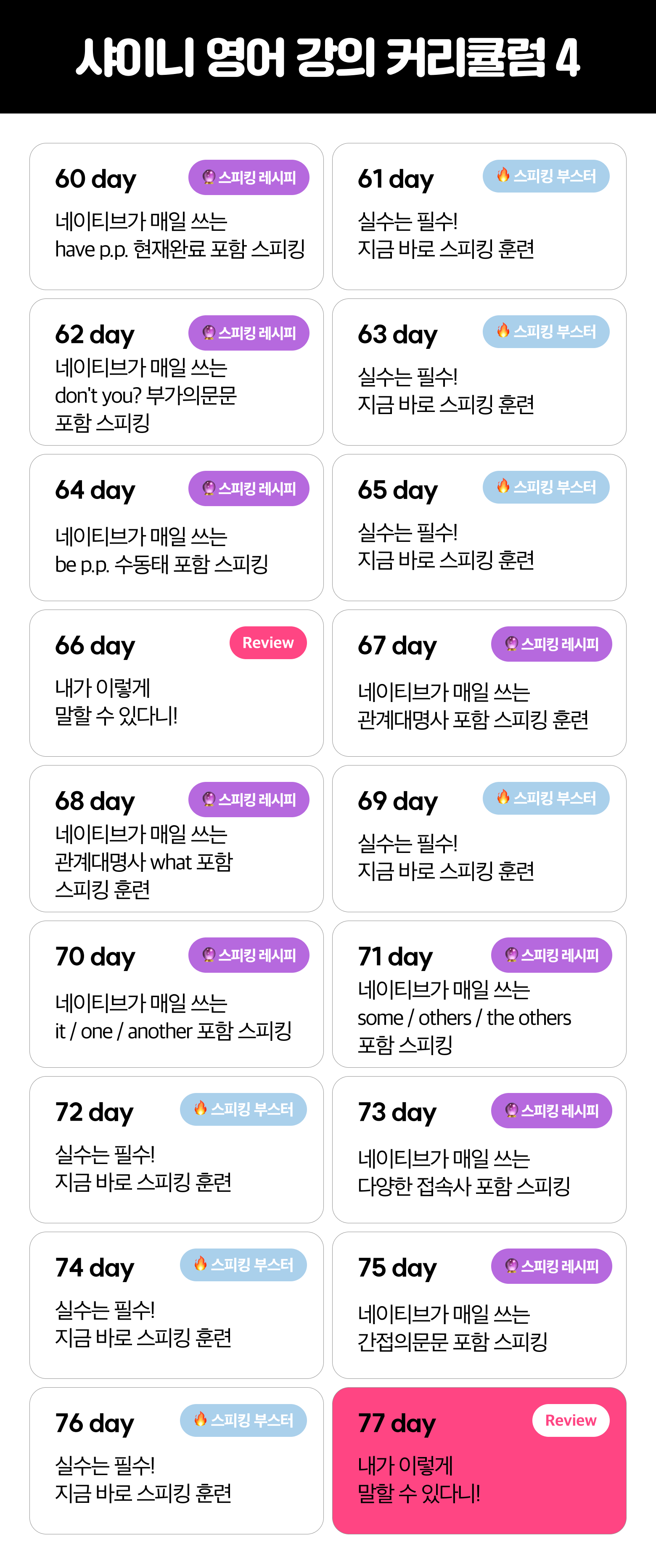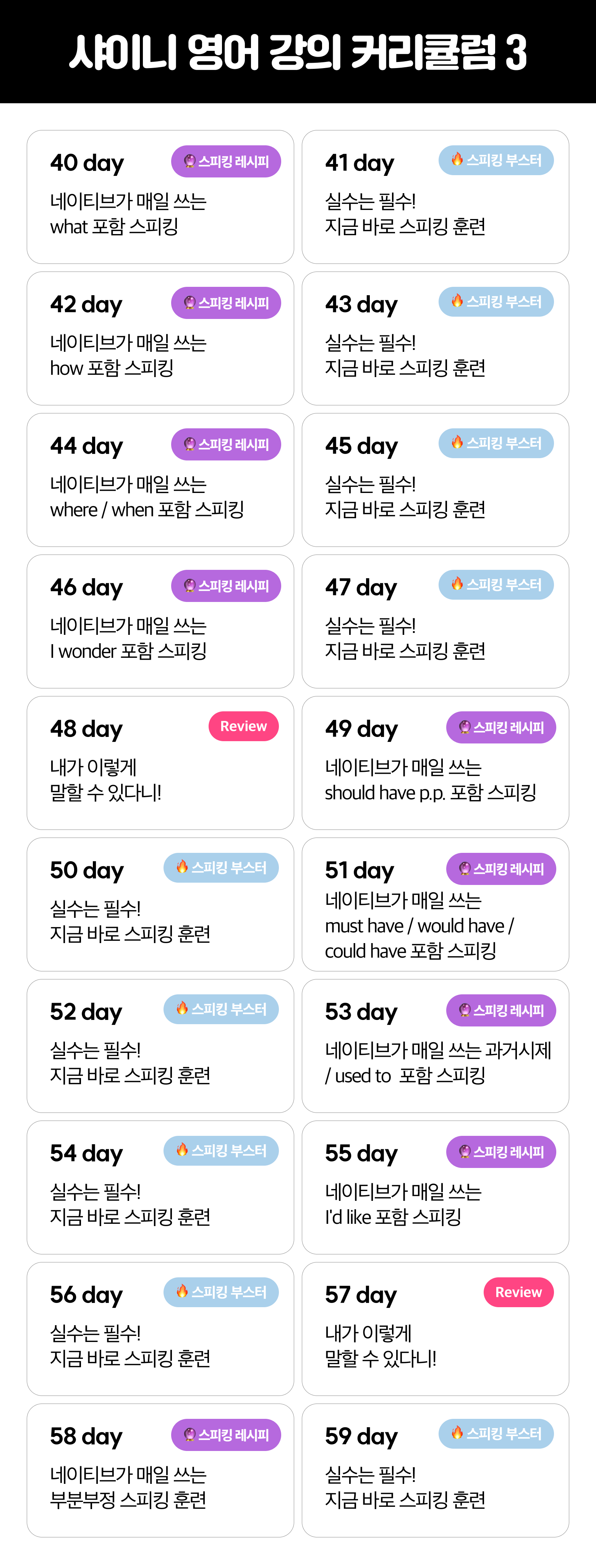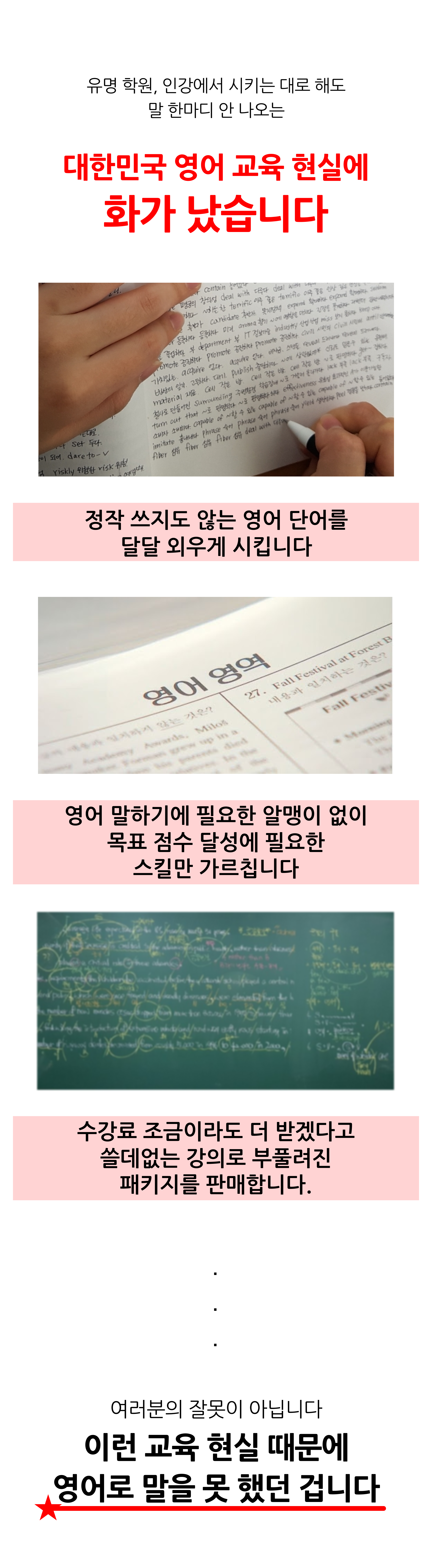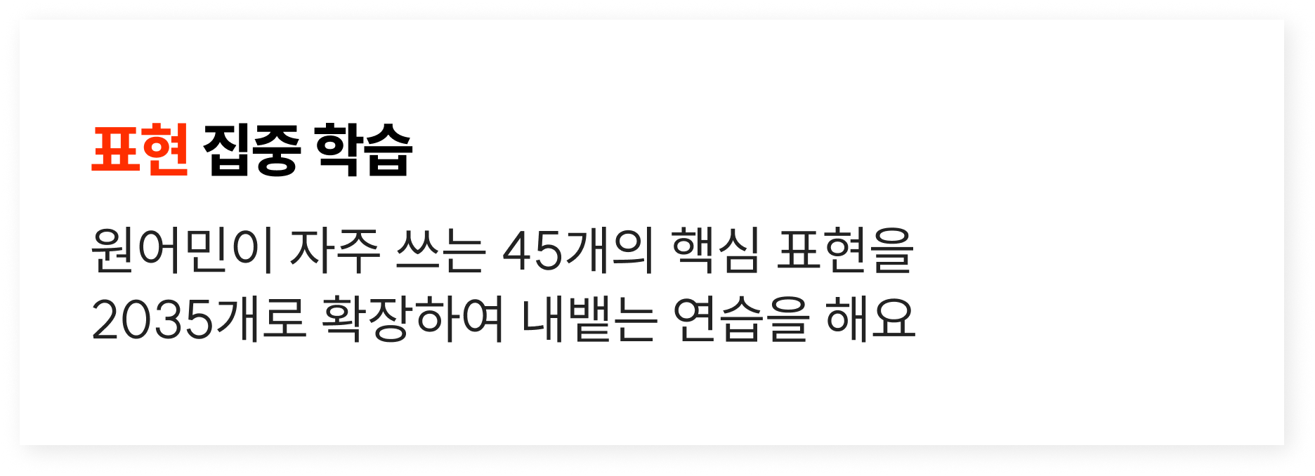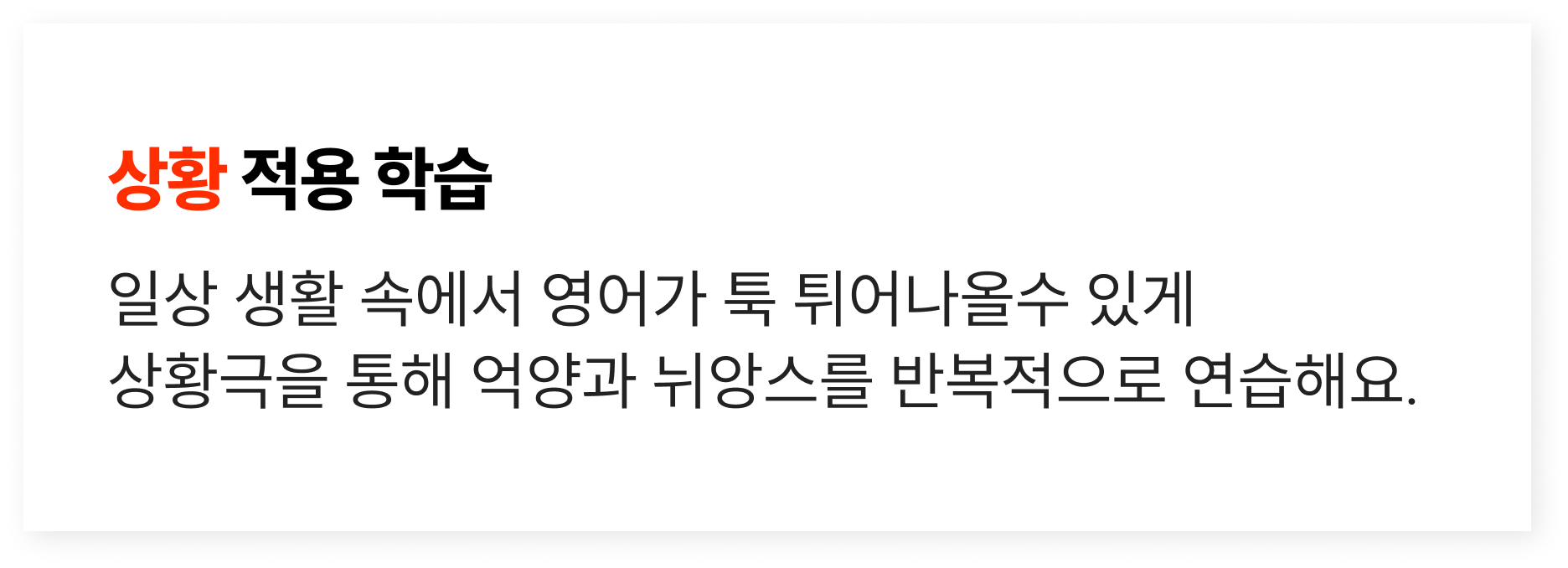 회화학습법 리얼 후기 강의 체험 한정 혜택 왜 하루 10분인가요? 45개가 2035개로 확장 되는 이유 샤이니 영어는 이렇게 공부해요! 옆으로 넘겨서 이번 주만 받을 수 있는 회화 학습 혜택을 확인하세요↔ 새롭게 시작해서 기대됩니다. ⭐⭐⭐⭐⭐ 복잡하고 머리아픈 방법이 아니고, 그냥 따라말하고 복습하고~ 확장하는 방식이라 잘 배우고 있습니다. 선물로 주신 워크북도 잘 활용 중입니다. 늘 감사합니다 작성자 : 정성민 작성일 : 2024.2.13 저도 성공할 수 있을까요!? ⭐⭐⭐⭐⭐ 일단 지금 2주정도 듣고 있어요ㅎㅎ 저는 진짜 초딩 영어 수준인데도 쌤 강의는 부담 없이 잘 듣고 있어요^^ 강의 틈틈이 응원해주셔서 덩달아 열심히 해보고 있네네요..! 영어로 말하고 싶어요 진심! 쫑아❤ 2024.2.05 너무나도 추천하고 싶네요 ⭐⭐⭐⭐⭐ 1. 강의가 재밌다. 2. 선생님이 너무너무 좋으시다 (긍정 에너지 짱!) 3. 영어로 말을 막 시키셔서 좋다. (실력 업ㅎ) 작성자 : 하늘쌤 작성일 : 2024.2.4 넘 좋아요~~!!!! ⭐⭐⭐⭐⭐ 현재 넘 만족하구 ㅜ 듣고있습니다!! 최고!! 옆방에서 남편이 왜이렇게 혼자 중얼거리냐구~ㅋㅋㅋㅋ 저보고 열심히 배우는 모습이 보기 좋다고 하네요ㅎㅎ..아자아자!! 작성자 : kangnahy 2024.1.29 더듬거리지만 말을 하긴 해요 ⭐⭐⭐⭐⭐ 저 왕초보였는데요 이렇게 눈에 띄게 성과?가 있는건 처음이에요~ 처음부터 끝까지 선생님이 같이 이끌어 주셔서 가능했던 것 같아요 감사합니다! 성장이좋아 2024.1.14 전화 영어 실패 후 샤이니 영어로 ⭐⭐⭐⭐⭐ 영어 회화가 꼭 필요해서 전화영어, 어플 영어 진짜 많이 시도해봤는데.. 이게 입이 안 떨어지고 긴장되니까 더 주눅들고.. 그러다 샤이니 영어 해봤는데^^ 부담도 없고 확실하게 완벽한 문장으로 연습하니까 정말 좋습니다. 최리 2023.12.31 [왕초보] 회화 스타트 강의 커리큘럼 [본강의] Day 1 ~ 21 학습 커리큘럼 [본강의] Day 22 ~ 39 학습 커리큘럼 [본강의] Day 40 ~ 59 학습 커리큘럼 [본강의] Day 60 ~ 77 학습 커리큘럼 [레벨업] 원어민표현 강의 커리큘럼 워크북 & 복습 키트 자세히 보기 👀 스크롤을 내리면 더 자세한 설명이 나와있어요! [슈퍼패키지 전용] 회화 특강 자세히보기 👀 🚨긴급 안내🚨 한정 수량으로 제작된 회화 훈련 세트가 예상 소진 시점보다 훨씬 빠르게 소진되고 있습니다.지금 이 글이 보이시는 분들까지는 100% 제공이 가능합니다. 품절 즉시 PDF 파일로 대체 될 수 있으니 서둘러 주세요. 상품구성 1) 하루 10분 입 트이는 매직 강의 (77강) 2) 진찐 왕초보를 위한 영어 레시피 강의 (15강) 3) 원어민 표현 배우기 이디엄 강의 (5강) 4) 워크북 & 성공 일기장 PDF ※ 정상 수강기간은 90일이며 이후 평생 소장입니다. 환불규정 – 환불신청서 제출 및 반품은 수령(배송완료)일 기준 7일 이내 가능합니다. – 수강 시작 후 7일 이내, 5강 미만 수강 시에는 100% 환불 가능합니다. – 수강 시작 후 7일 이내 5강 이상 수강한 경우에는 정상 수강기간을 기준으로 수강진도에 따라 환불 가능합니다. – 수강 시작일은 결제일로부터 기간이 산정됩니다. (사전 예약 강의의 경우 1차 강의 오픈일부터) – 회사 사정으로 수강 시작이 늦어진 경우에는 해당 일정 만큼 수강 시작일이 연기됩니다. – 더 자세한 환불 규정은 [취소/환불정책]을 참고 바랍니다. 유의사항 – 구성품은 사전고지 없이 제외 또는 변경될 수 있습니다. – 학습지, 온라인 강의, 굿즈는 패키지 상품으로 단독 구매가 불가합니다. – 상황에 따라 사전 공지 없이 할인이 조기 마감되거나 연장될 수 있습니다. – 이벤트, 프로모션 등으로 가격이 변동될 수 있으며, 이로 인한 환불이나 가격 보상은 불가능합니다. – 분할 출고되는 상품을 구매하신 고객 중, 제품 수령지 변경을 원하실 경우 고객센터로 문의하시기 바랍니다. – 제품 수령지 미변경으로 인한 분실/배송비 부담에 대해서는 책임지지 않습니다. – 천재지변, 폐업 등 서비스 중단이 불가피한 상황에는 서비스가 종료될 수 있습니다. – 소셜로 가입한 경우 소셜 로그인을 통해서만 이용이 가능하며 다수의 기기에서 수강이 불가합니다. ※ 위 내용은 회사 사정에 따라 언제든지 변경될 수 있습니다. ※ 유의사항 미숙지로 인한 불이익에 대해 책임지지 않습니다.