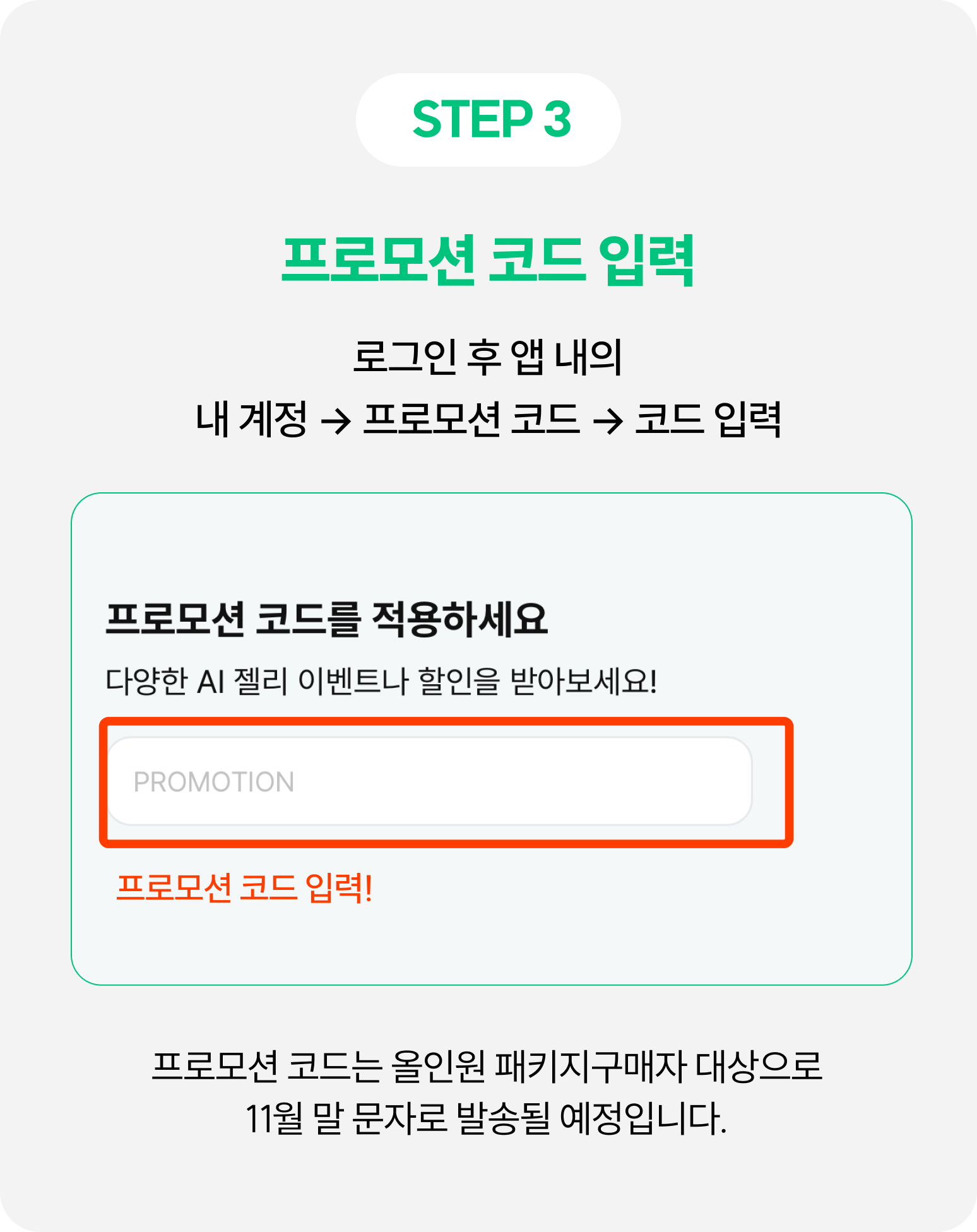 - 샤이니 영어 강의를 수강하고 계시면 구매시 작성한 번호로 프로모션 코드가 발송됩니다 (문자 메세지)